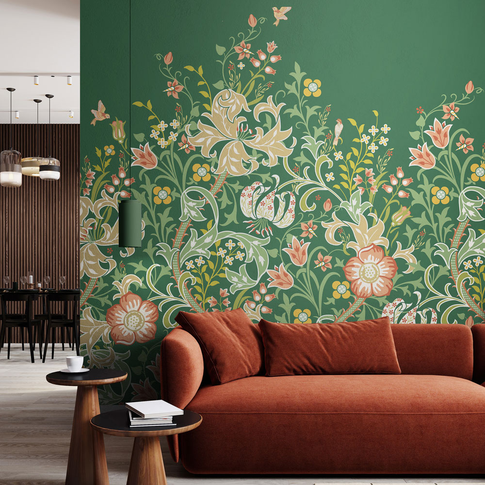 Embrace the vibrant energy of this wallpaper, where stylised lily flower heads and foliage tendrils dance around a subtle ogee trail. A colourful and confident reimagining of John Dearle',s design for William Morris, this print brings a touch of artistic heritage to your home.