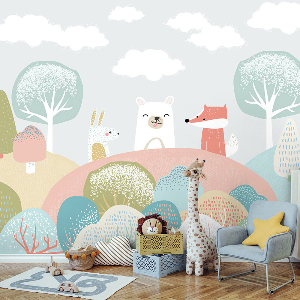Bring woodland magic to your child's room with this enchanting wall mural. Featuring a rabbit, bear, and fox nestled amongst patterned trees and shrubs, this charming scene depicts the animals chatting and making plans for their next adventure together. A delightful design guaranteed to spark imagination and add personality to any nursery or bedroom.