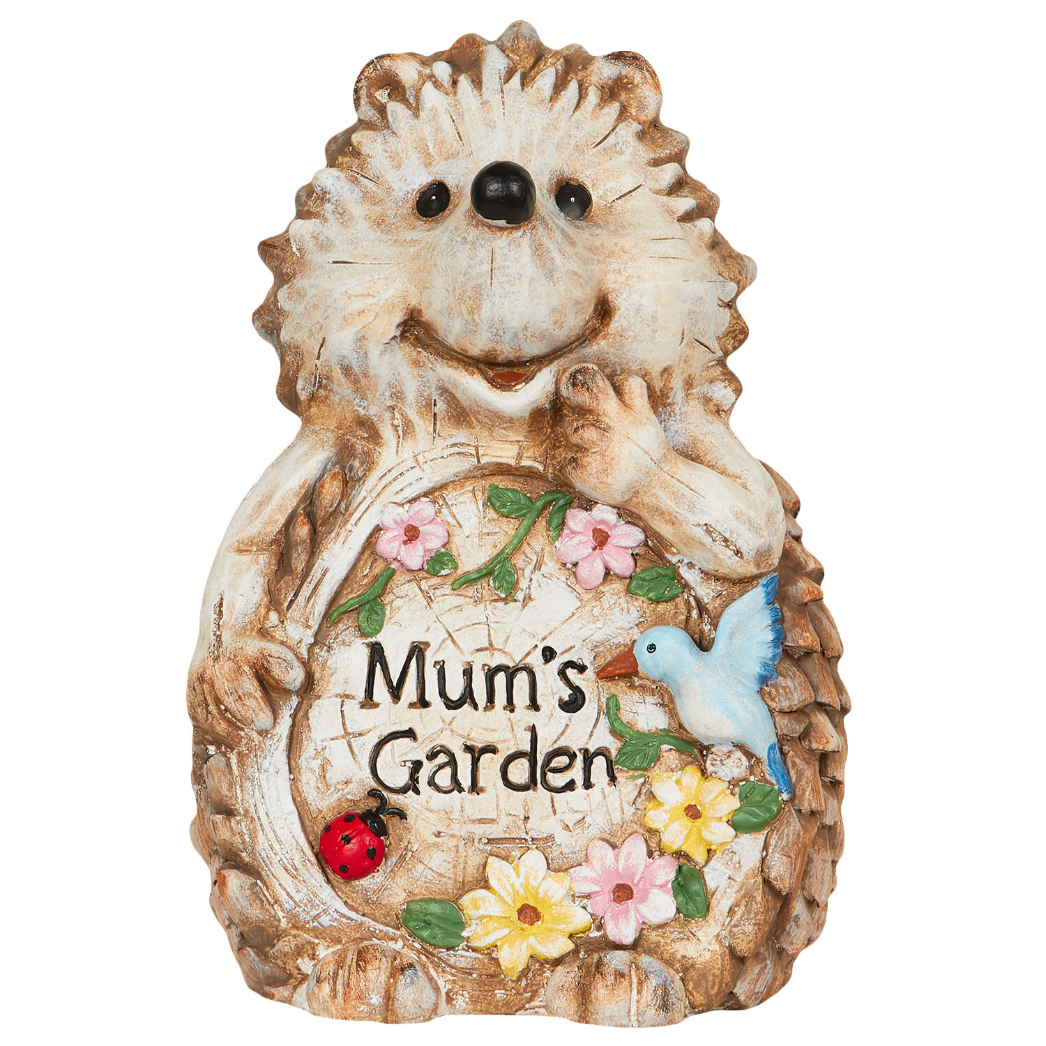 Bring a touch of whimsy to your garden with this delightful 'Mums Garden' Hedgehog ornament. This charming piece showcases a lifelike hedgehog design, adorned with a sweet 'Mums Garden' inscription amidst a decorative array of flowers, birds, and insect designs, perfectly capturing the essence of a thriving garden space. Crafted for outdoor use, it's an excellent present for Mother's Day or any avid garden enthusiast.