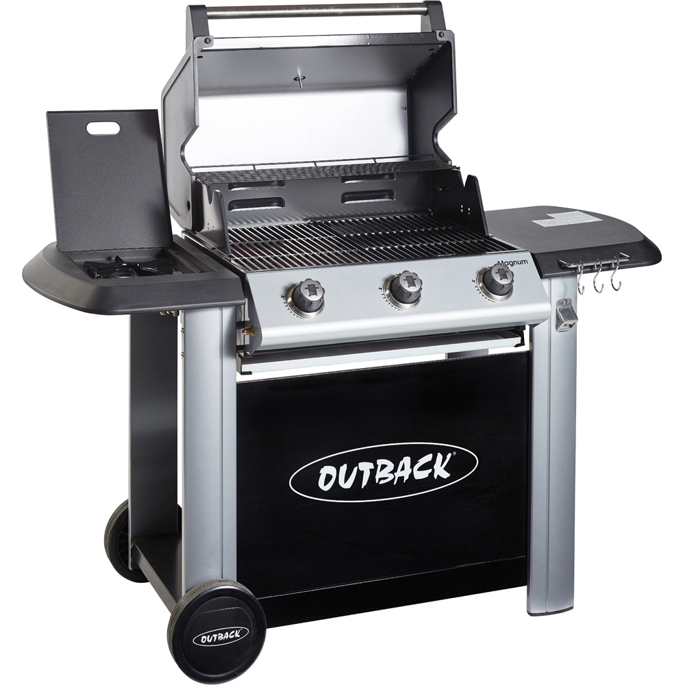 Experience the ultimate outdoor cooking versatility with the Outback Magnum Hybrid 3 Burner Barbecue. This innovative hybrid model allows you to switch between gas and charcoal grilling effortlessly. Featuring a multi-cooking surface, three stainless steel burners, and a charcoal basket, it's perfect for any culinary adventure. The added side burner, warming rack, and side table ensure you have everything you need at your fingertips.