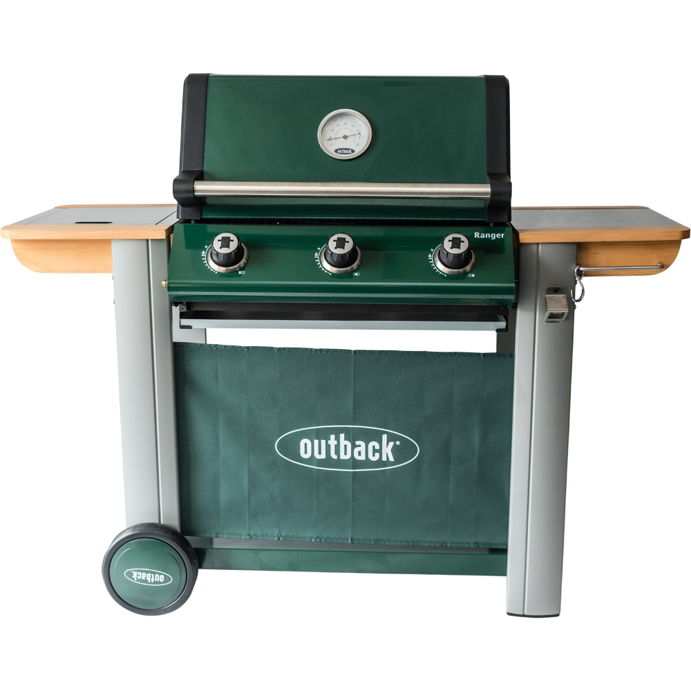 Elevate your outdoor cooking with the Outback Ranger 3 Burner Hybrid Gas Barbecue. Featuring a durable porcelain enamel green hood, this barbecue is designed to resist rust and scratches, ensuring long-lasting performance. The side burner provides additional cooking space, perfect for preparing side dishes or sauces. The interchangeable cast iron cooking grill offers the flexibility to switch between a ceramic pizza stone, cast iron griddle, cast iron paella dish, wok, and steak grill, making it ideal for a variety of culinary adventures. This exceptional barbecue combines cutting-edge design with unmatched versatility, allowing you to grill with gas or charcoal for mouthwatering results every time.