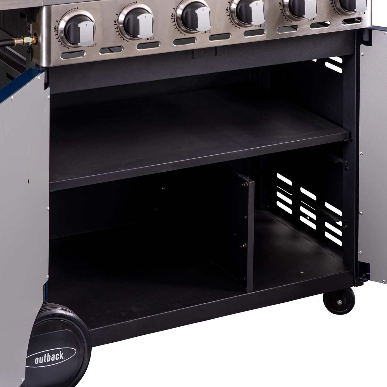 Grill your favourite foods on this Outback Saturn Pro 6 Burner Gas BBQ. Ideal for outdoor parties, this BBQ set-up is equipped with six gas burners to give you plenty of cooking space. Functional and stylish, its blue enamel body looks elegant, and the storage cabinet provides ample space for essentials. This gas BBQ also has a porcelain enamel hood, temperature gauge, warming rack, side burner, storage cabinet and utility baskets for convenience.