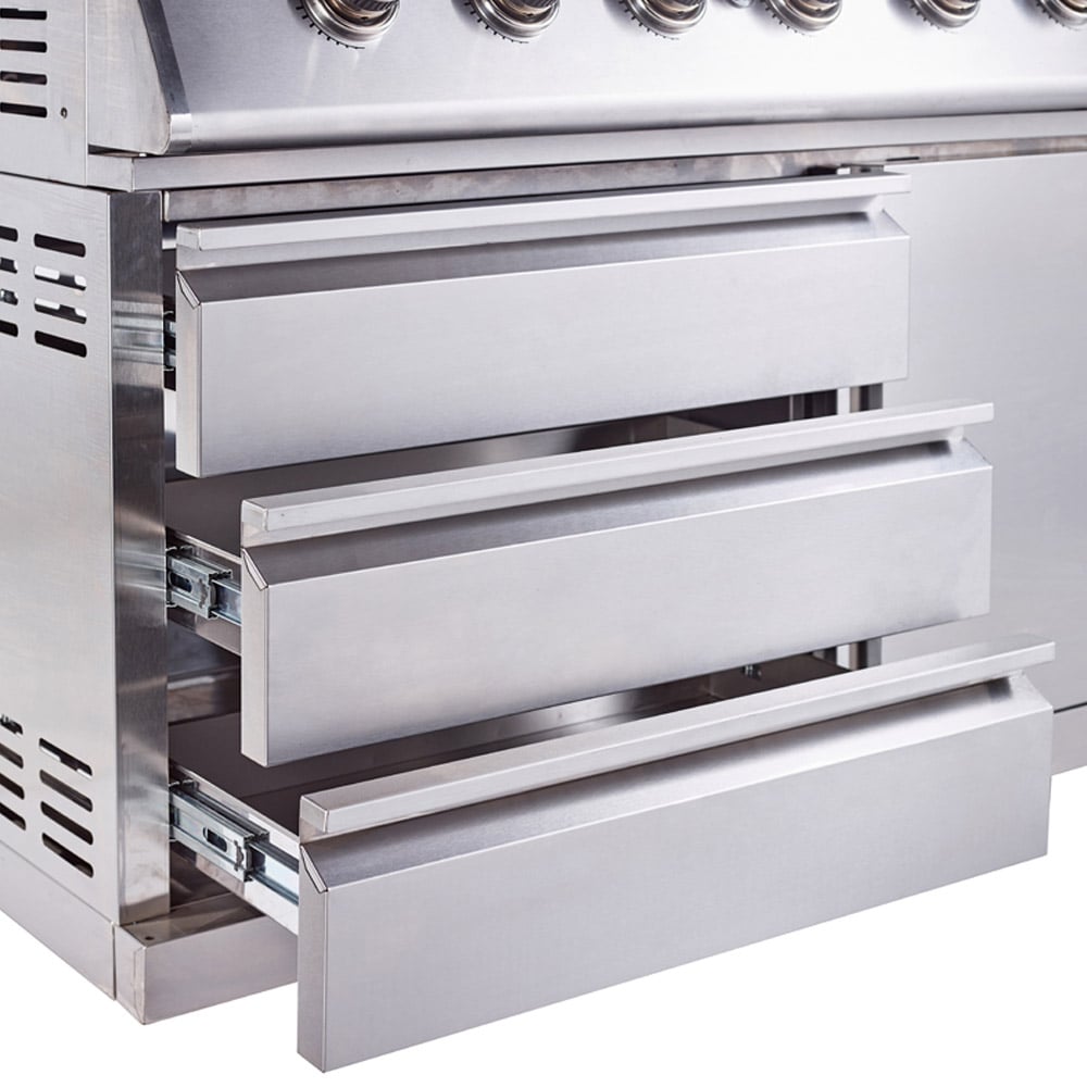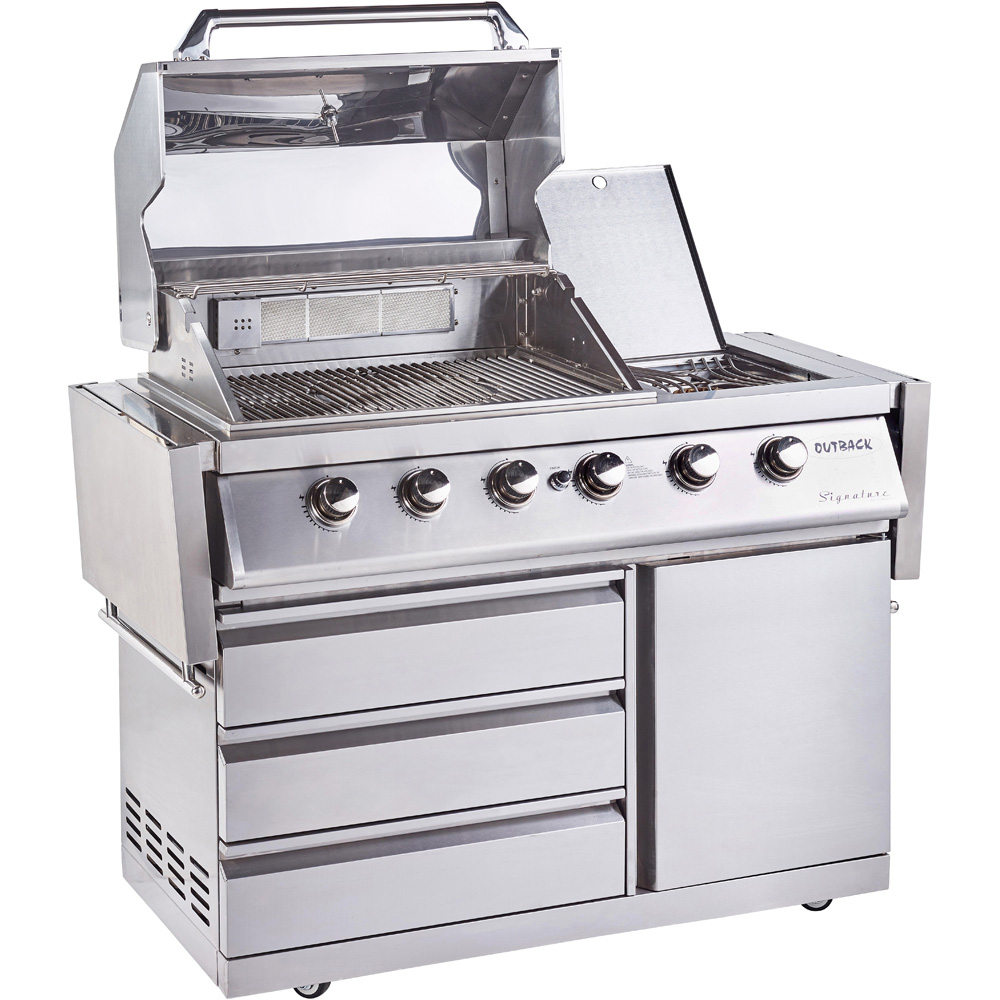 Transform your outdoor cooking with the Outback Signature II Hybrid 4 Burner Gas Barbecue, a pinnacle of luxury and convenience. Fully assembled and adored by al fresco enthusiasts, this barbecue features the innovative Multi-Cooking Surface system, allowing you to switch the circular grill for a pizza stone, griddle, wok, or other Outback MCS surfaces. This stainless steel model includes auto electronic ignition, a temperature gauge, extensive grill and roasting areas, ample storage, rear and side brass burners, a ceramic infrared back burner, and a warming rack. Optional extras like an electric-powered rotisserie make this the ultimate choice for luxury barbecuing.
