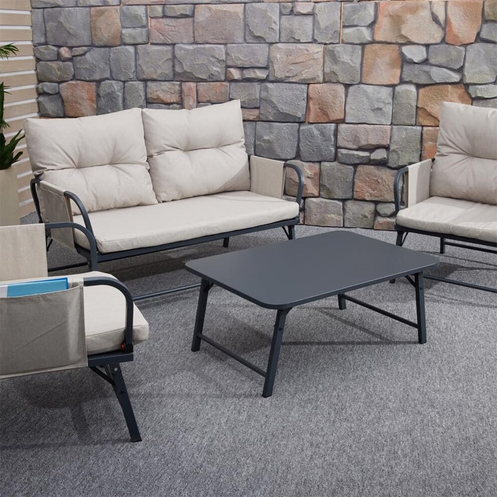 Savour the summer months in elegance with this four-piece foldable tea set. Designed for effortless enjoyment, its foldable structure ensures swift assembly and convenient storage when not in use. Comprising a sofa, two chairs, and a coffee table, this delightful patio set is perfectly suited for garden parties, barbecues, friendly catch-ups, and more. Sink into relaxation with the addition of sumptuously soft cushions, allowing you to unwind in both style and comfort. To ensure your garden furniture remains in pristine condition, explore our range of heavy-duty garden furniture covers for the ideal protection.