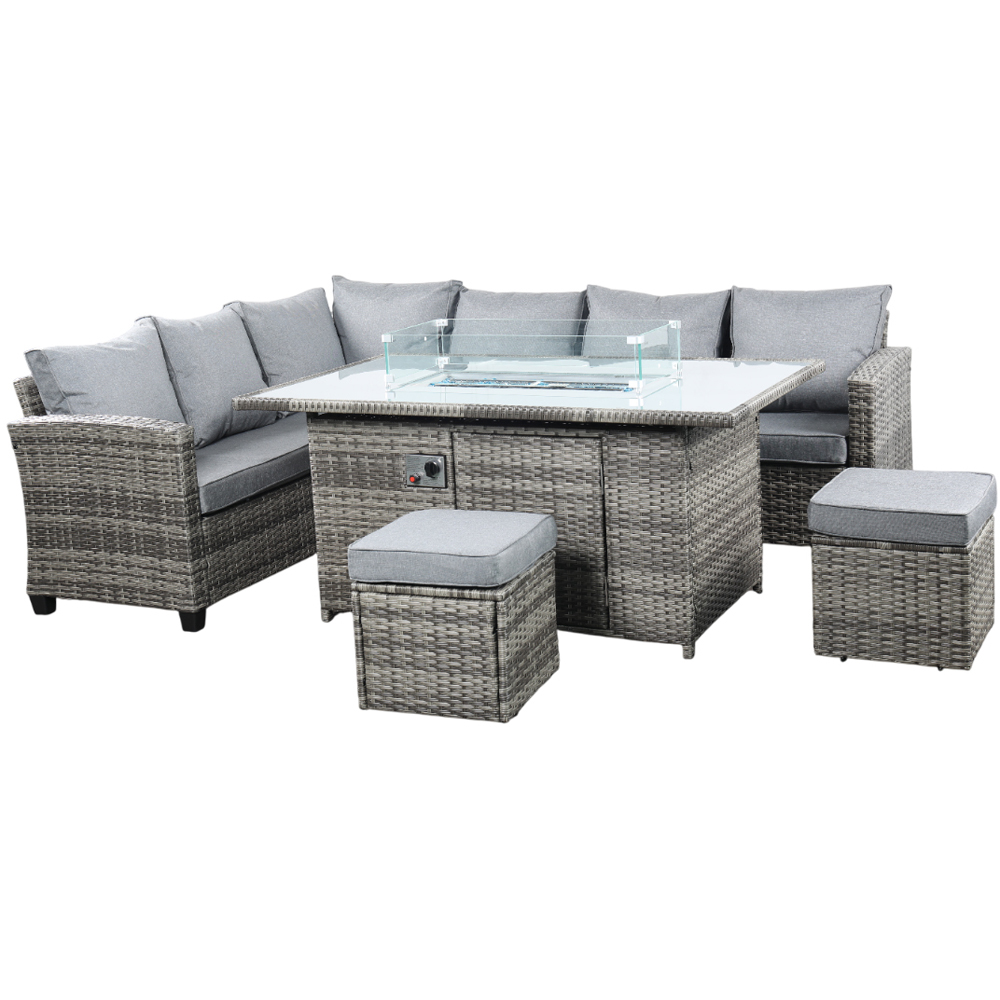 Outdoor Living The Conwy 8 Seater Rattan Corner Gas Firepit Outdoor Dining Set Mixed Dark Grey