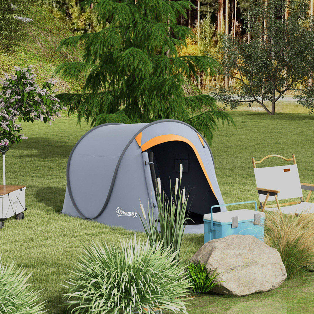 Explore the great outdoors with the Outsunny 2 Person Waterproof Camping Tent Grey and Orange. The tent is perfect for day trips, overnighters, and beginner-level backpacking trips. It comfortably houses two people, making it perfect for family trips and adventures with friends. With a 2000mm waterproof fabric shell, you'll stay dry and protected from mild outer weather. The inner floor keeps you dry, and the pop-up design makes this lightweight tent easy to assemble and pack away, taking the stress out of your camping experience. Plus, the large door provides easy access, and the mesh window ensures you stay cool and comfortable. So why wait? Get your instant pop-up tent today, complete with a convenient carrying bag, and start your adventure.