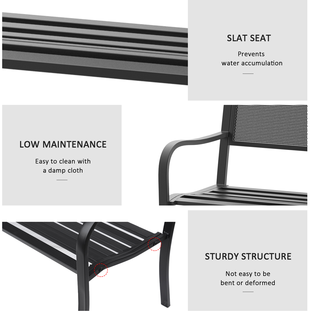 Upgrade your outdoor space with the Outsunny 2 Seater Black Mesh Back Garden Bench. The blooming two-seater garden bench from is ideal for enjoying your favourite peaceful spot, along a path, under a tree, or among the flowers. This garden bench seat is constructed with a steel frame to ensure a durable patio garden bench for years to come. The durable powder-coated steel finish provides a sturdy yet comfortable frame that is rust-resistant and weather-resistant. The classic matte black finish complements any setting and looks great with any existing outdoor decor while presenting a clean and classic look. The uniquely designed bench features an antique style with a distinctive mesh pattern backrest, adding elegance to your front or backyard. Relax with friends or family members and enjoy the scenery of your front or backyard. The tough steel construction and 120cm length of the bench allow for two individuals to comfortably sit at once. Protect your garden furniture with our durable and waterproof covers. Explore our wide range of heavy-duty Garden Furniture covers to find the perfect fit for your needs.