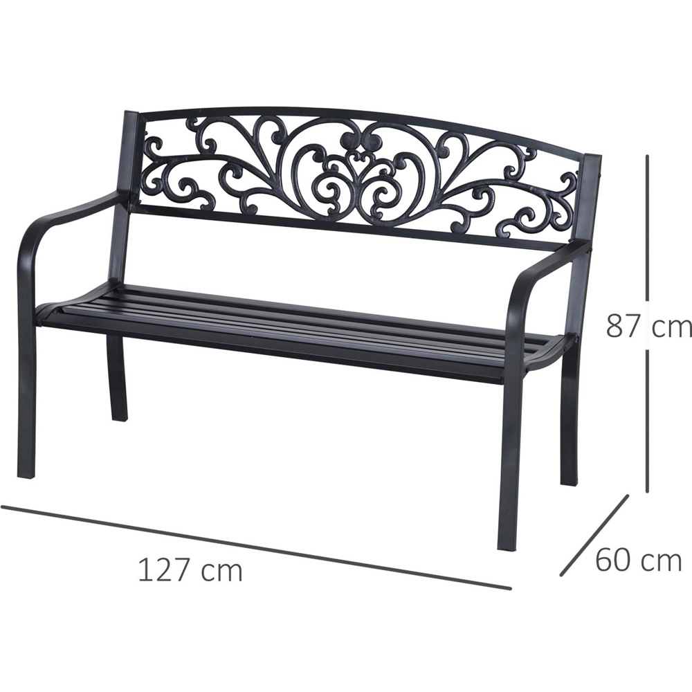 This garden bench from Outsunny is ideal for enjoying your favourite peaceful spot, along a path, under a tree, or among the flowers. It is constructed with a steel frame in black to make it both stylish and durable. Its 120cm length allows for two individuals to comfortably sit and relax at once. Beautifully designed with powder coating, the bench features a floral design on the backrest to complement your outdoor décor in style. Pretty and practical, it offers a comfy place to relax with friends or family and enjoy the scenery of your outdoor space. Protect your garden furniture with our durable and waterproof covers. Explore our wide range of heavy-duty Garden Furniture covers to find the perfect fit for your needs.