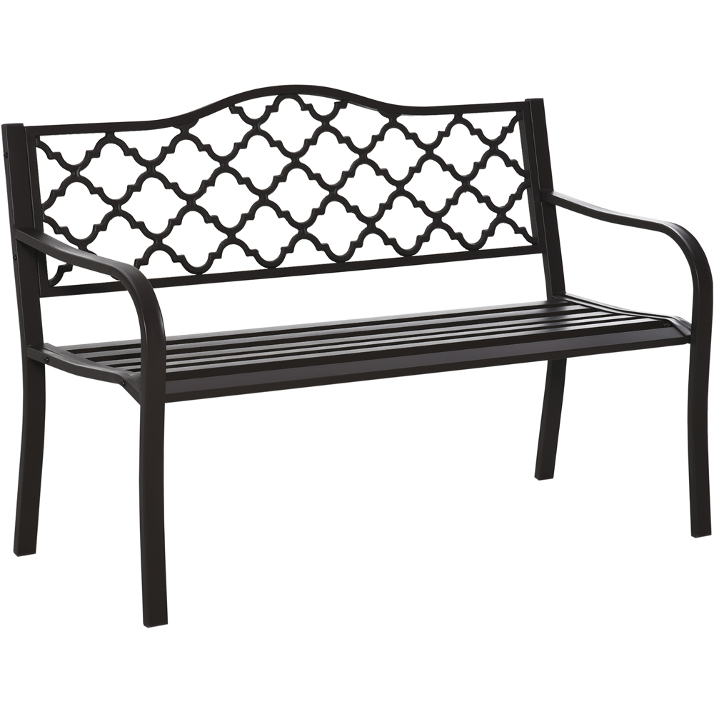 Sit, relax and rest outdoors in style with this Outsunny 2 Seater Brown Cast Iron Antique Garden Bench with Armrest. Made from steel with a powder coating for protective strength, the backrest has been crafted into a beautiful cut-out pattern. This garden bench can also be customised to how you want - weaving flowers and materials there as an idea. This garden loveseat is perfect for taking time out, reading a book in the sun or simply socialising with friends. Protect your garden furniture with our durable and waterproof covers. Explore our wide range of heavy-duty Garden Furniture covers to find the perfect fit for your needs. Overall Dimensions: H89 x W60 x L128cm. Seat Height: 43.5cm. Seat Size: W124 x D44cm. Armrest Height: 62cm. Backrest Size: H40 x W120cm. Weight Capacity: 280kg.