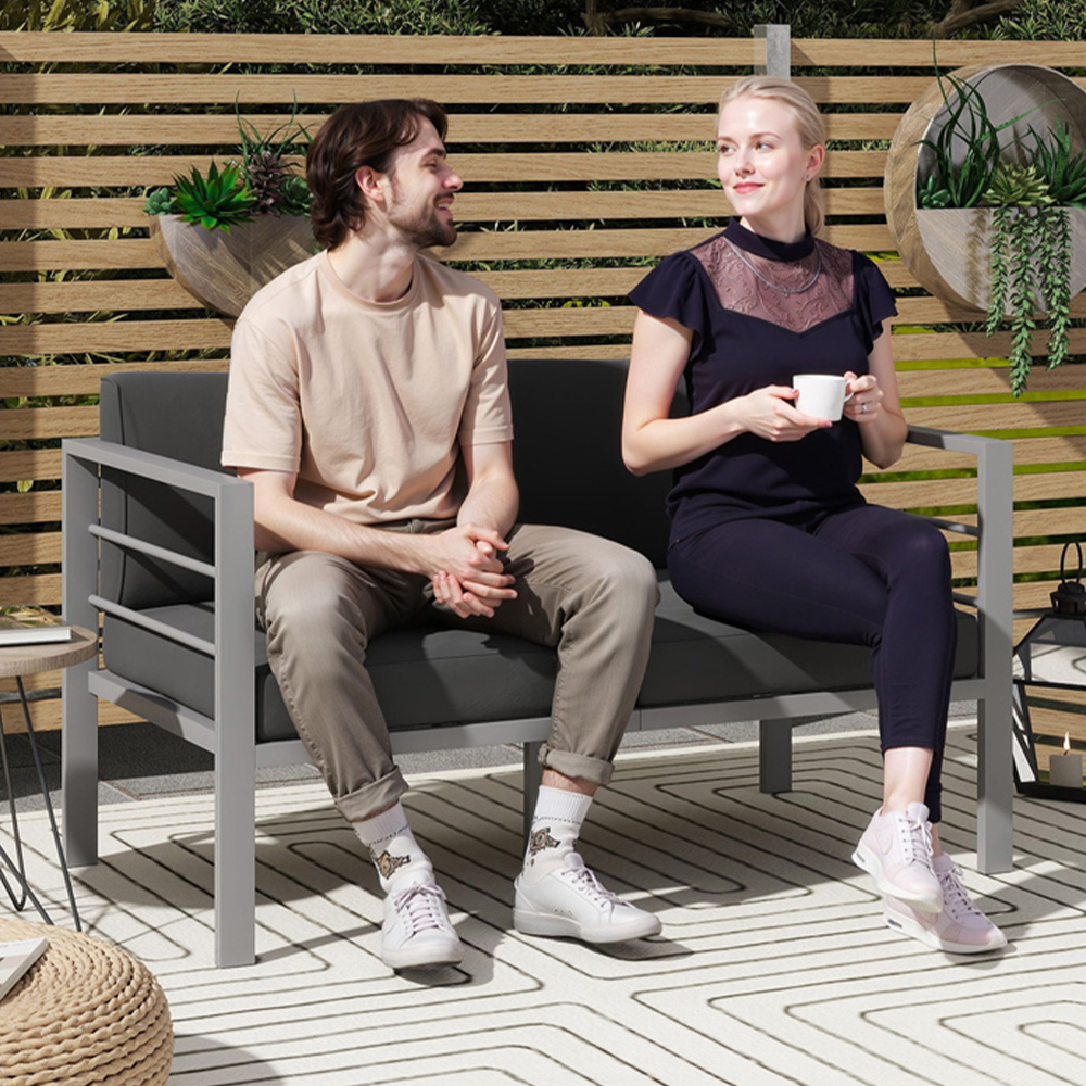 Sink into sumptuous comfort with the Outsunny garden loveseat. This sleek, minimalist outdoor sofa, upholstered in plush polyester fabric with a sponge filling, is the perfect spot to unwind. The water-resistant, zipped cushions ensure easy maintenance, whilst its stylish design effortlessly elevates your garden as a chic bench or charming couch.