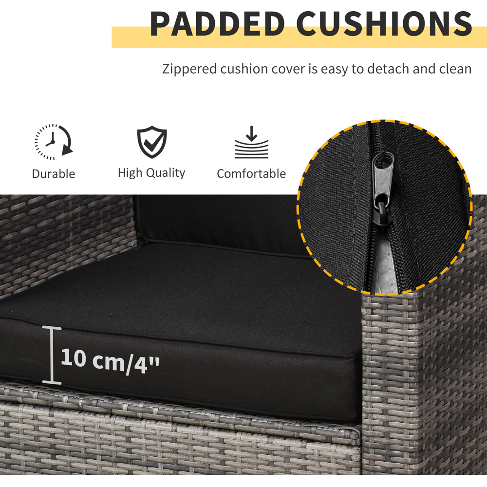 Feel the comfort while you relax with the Outsunny Two Seater Rattan Bistro Set. This grey set includes two armchairs and a matching table with a thick tempered glass top. This set features strong metal frames covered with PE rattan wicker making it sturdy and durable. The cosy padded seats and back cushions provide ultimate comfort for relaxation purposes. Protect your garden furniture with our durable and waterproof covers. Explore our wide range of heavy-duty Garden Furniture covers to find the perfect fit for your needs.