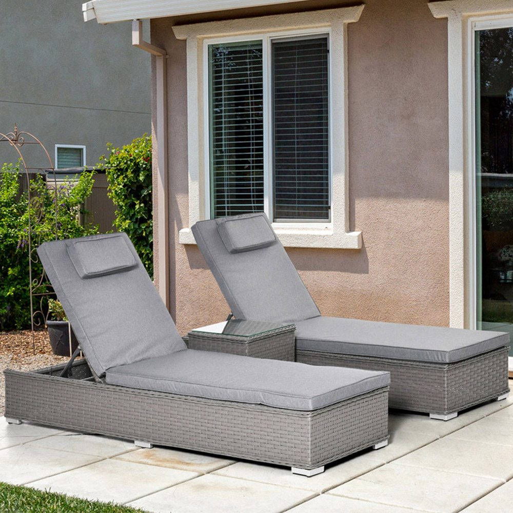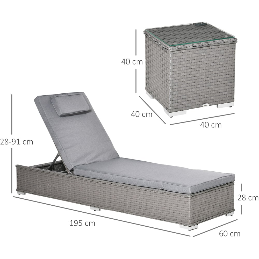 Enhance those long summer days with this Outsunny two-seater Grey Rattan Recliner Sun Lounger Set. The set includes two loungers and a small, matching side table, ideal for keeping drinks, sunscreen, and other essentials close at hand as you unwind in the sunshine. For optimal comfort, each lounger adjusts to five different positions, including a fully reclined 180° option. Sink into the grey padded cushions, complete with head pillows for enhanced neck and head support.