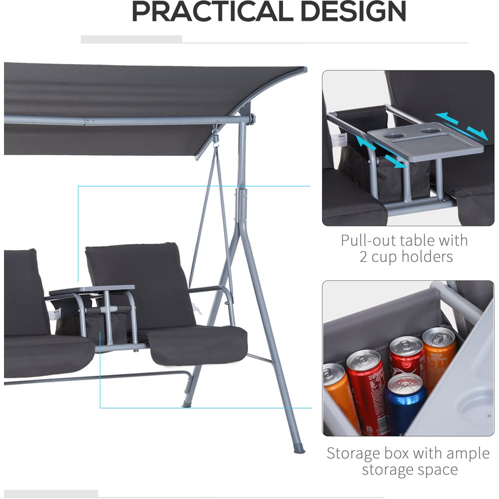 Experience outdoor relaxation like never before with the perfect addition to your garden, patio, or balcony, the Outsunny 2 Seater Grey Steel Swing Chair with Table and Canopy. This stylish and functional seating solution features a robust A-shaped metal frame designed to maintain stability, ensuring you can enjoy your time outdoors with peace of mind. The padded seat covers offer both UV and weather resistance, providing lasting comfort while securely fastening to the frame with tie fastenings. A handy middle table with two cup holders keeps your refreshments close at hand, making it the ideal spot to unwind with a friend. Assembly is required for this enticing piece that enhances any outdoor space. Overall Dimensions: H163 x W110 x L175cm. Canopy Size: W110 x L170cm. Seat Size: H45 x W48 x L51cm. Cushion Thickness: 5cm. Net Weight: 22kg. Weight Capacity: 180kg.