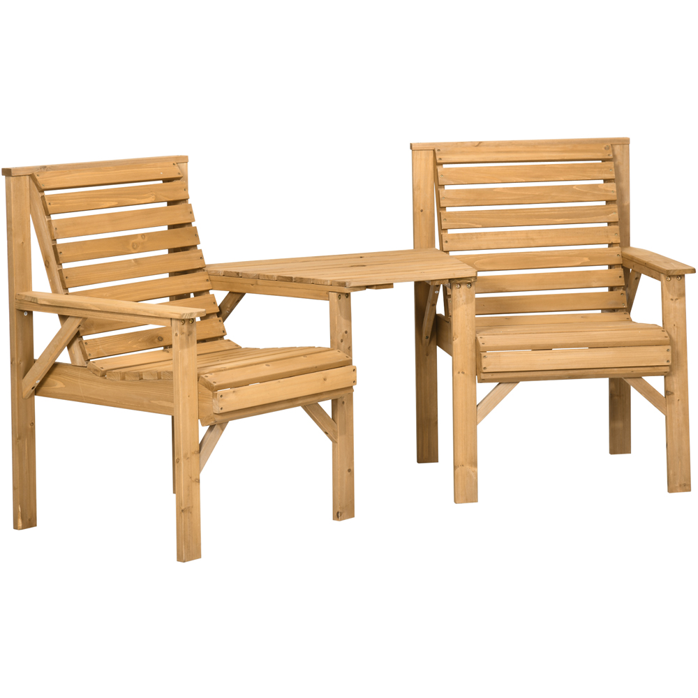 Get the most out of the warm weather with this Jack and Jill Wooden Companion Love Seat from Outsunny. This garden seat forges two seats and a table into one design to enjoy outdoor time with some company. Made from fir wood with a paint coating, it is strong and perfect for outdoor use. The middle table creates a handy resting spot, with a centre hole to hold a parasol - keeping you safely shaded in the sun. Comfortable to use, the slanted back and armrests complete this piece to give your body support as you rest. Colour: Brown. Protect your garden furniture with our durable and waterproof covers. Explore our wide range of heavy-duty Garden Furniture covers to find the perfect fit for your needs. Chair Dimension: H90 x W66 x D65cm. Tabletop Dimension: H3 x W79/38 x D56cm. Seat Size: H44 x W50 x D44cm. Back Size: H47 x W50cm. Parasol Hole Size: Diameter 6cm. Weight Capacity: 130kg (per seat), 50kg (tabletop).
