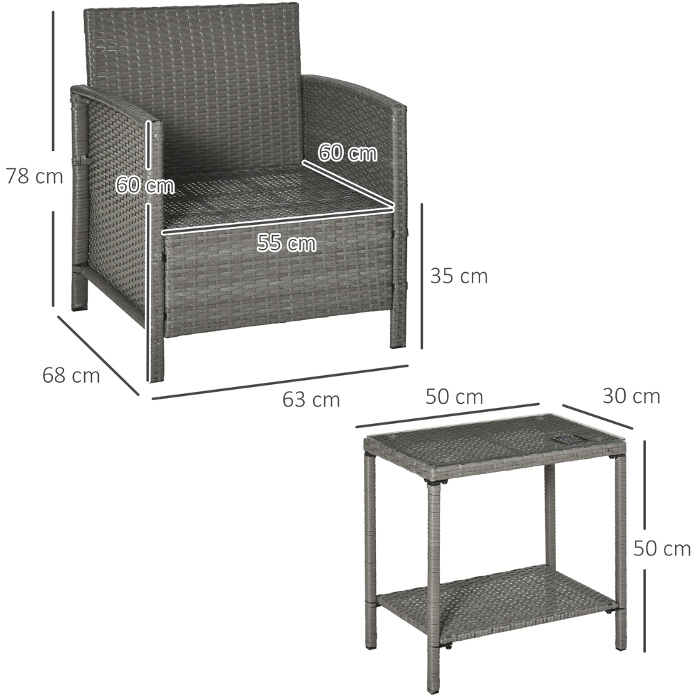 Make the right choice for the upcoming Summer season with this Rattan Effect Two-Seater Bistro Set in Light Grey with Cushions from Outsunny. The garden bistro set for two, made of powder-coated, rust-resistant steel, ensures a strong and stable base. The PE wicker makes it sturdy, durable, easy to clean and resistant to UV and light water damage. The rattan two chairs and table set are placed with thick cushions on the seat for prolonged comfort, with removable and washable covers to keep them clean. And a stylish striped bolster cushion on each seat for extra comfort and support. The set is completed with a matching two-tier table and a tempered glass top for a chic finishing touch. This garden bistro set featuring two wide armchairs and a matching coffee table is perfect for relaxing under the sun with someone, in your garden, on your patio, on the balcony, etc. Protect your garden furniture with our durable and waterproof covers. Explore our wide range of heavy-duty
