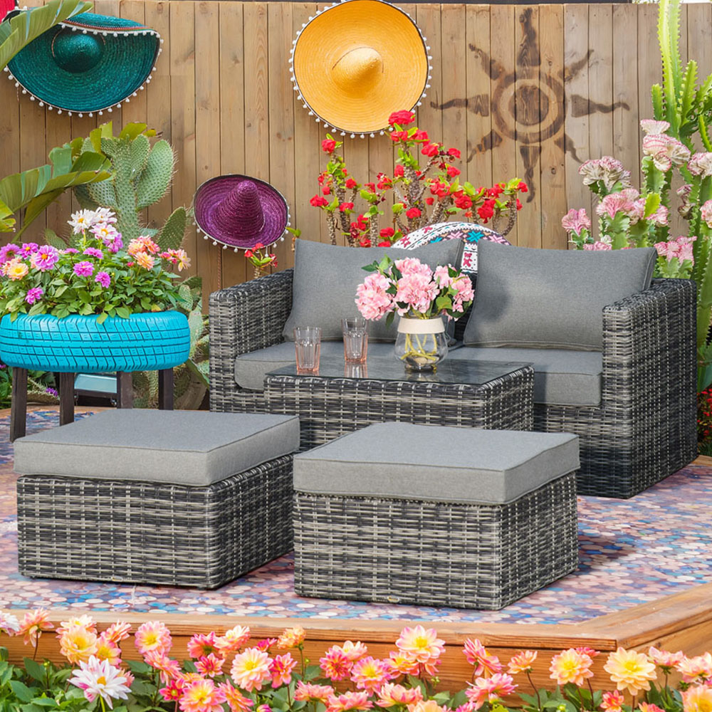 Transform your outdoor space into a haven of relaxation with the Outsunny Rattan Sun Lounger Set. This stylish mixed grey set features two corner armchairs, two comfortable footstools, and a coordinating coffee table topped with smooth glass. Built with robust aluminium frames and wrapped in hand-woven PE rattan, this set is designed to withstand mild weathering and resist UV fading. Sink into the thickly padded seat and back cushions for unparalleled comfort as you relax and enjoy the pleasant weather. To ensure your garden furniture stays in pristine condition, explore our range of durable and waterproof garden furniture covers.
