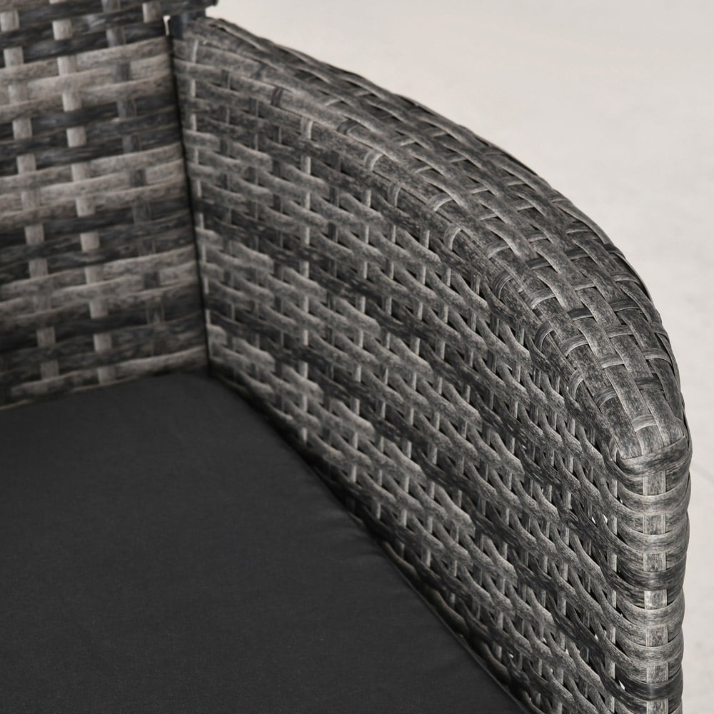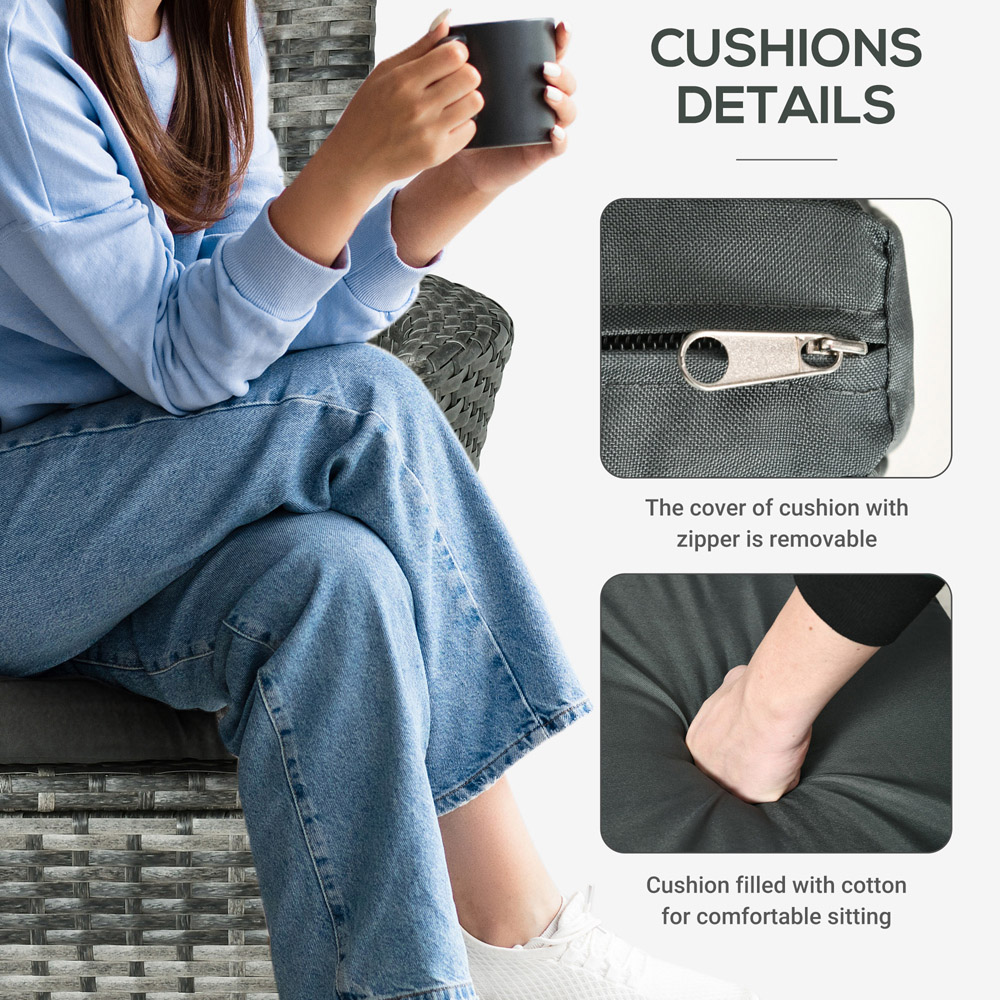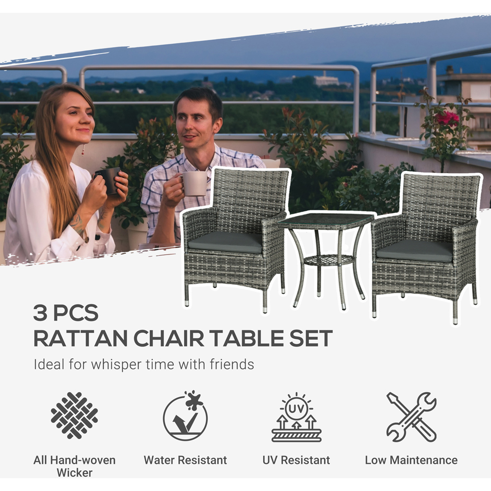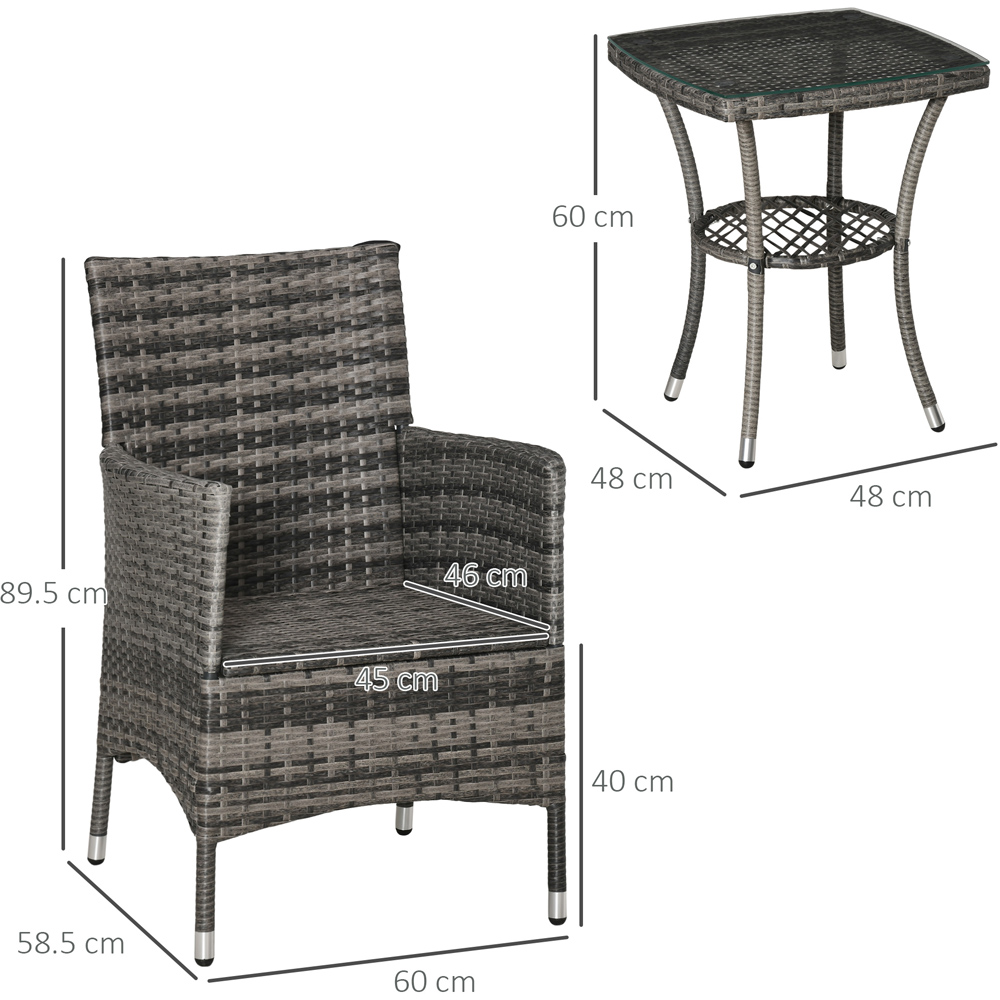 Unwind in style with the family with this beautifully crafted Outsunny 2 Seater Rattan Bistro Set in Light Grey. This modern three-piece bistro set is designed to comfortably seat two people and offers a robust and long-lasting option for outdoor areas such as patios, gardens, and porches. The set features powder-coated steel frames, ensuring a strong structure, wrapped in plastic PE rattan wicker for a classic garden aesthetic. Water-resistant and UV-protected, this set is suitable for all weather conditions. It includes a matching table with a glass top. The deep armchairs are equipped with soft, padded cushions that are removable and machine washable. The two-tier table boasts slim, angled legs, providing both a modern look and a stable base. The clear tempered glass top is easy to clean with a damp cloth.