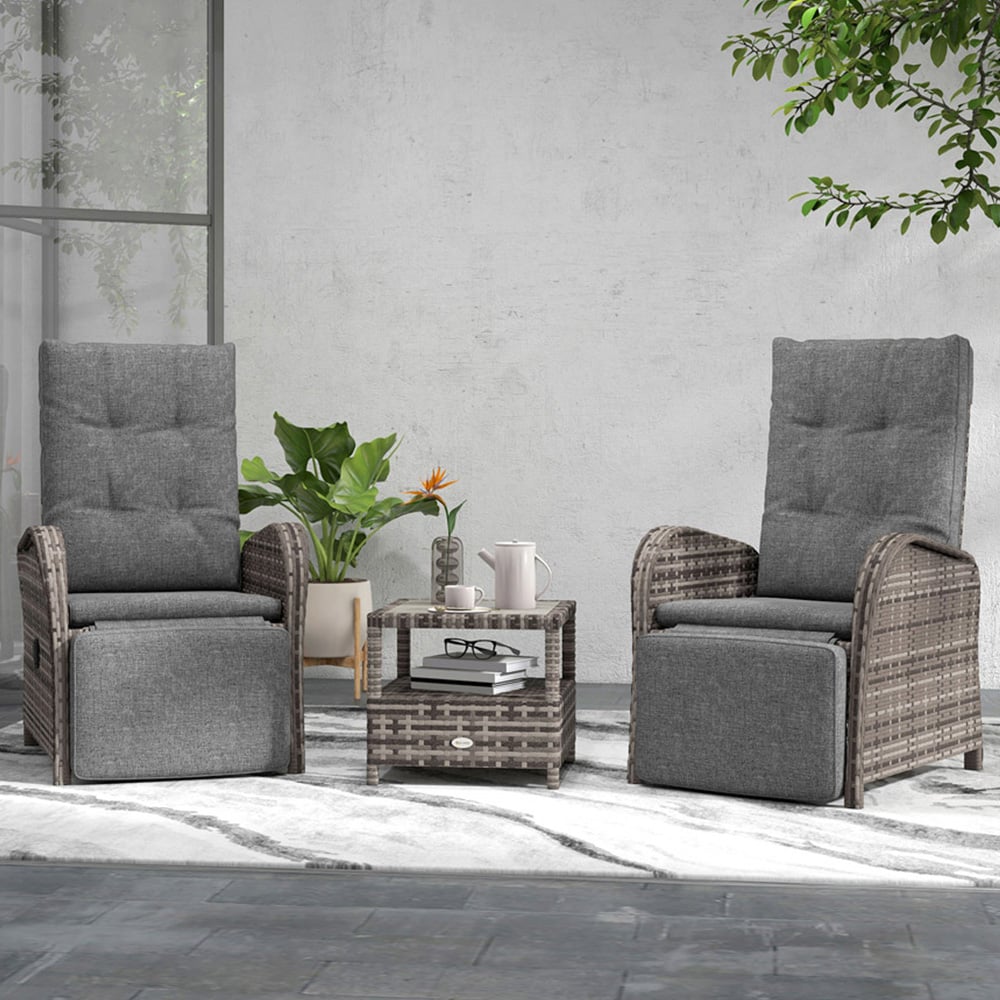 Enjoy the outdoor view with the Outsunny 2 Seater Rattan Wicker Chaise Lounge Sofa Set. This grey set includes two reclining chairs with a matching coffee table. The two chairs feature a reclining back with a maximum 150° angle and adjustable footrests to elevate your lower body. This set features powder-coated aluminium frames wrapped in plastic rattan for a stylish look and feel. Protect your garden furniture with our durable and waterproof covers. Explore our wide range of heavy-duty Garden Furniture covers to find the perfect fit for your needs.