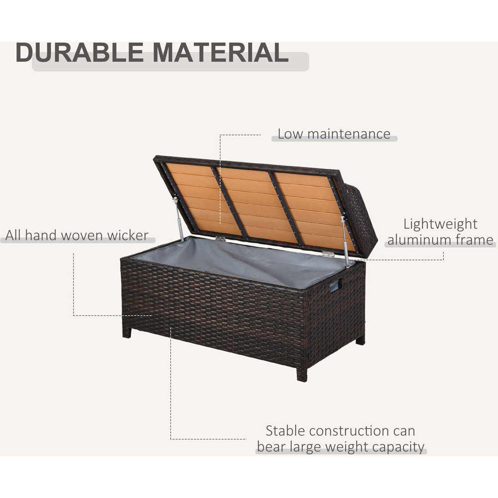 Add a versatile option to your garden set with this Outsunny Two-Seater PE Rattan Storage Bench with Brown Cushion by Outsunny. This Rattan storage box has a seating place for two people, which is an excellent addition to your outdoor living space. It is made using an aluminium frame and covered with PE rattan to eliminate the risk of rust and fade. With seating for two, it also has a 130l storage box underneath to keep the seating cushion when not in use. You can also use the storage area to keep magazines and books handy while enjoying the outdoors. Protect your garden furniture with our durable and waterproof covers. Explore our wide range of heavy-duty Garden Furniture covers to find the perfect fit for your needs.