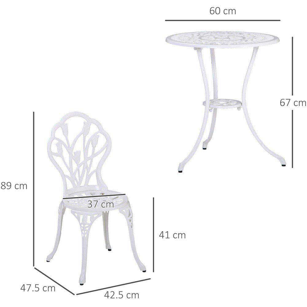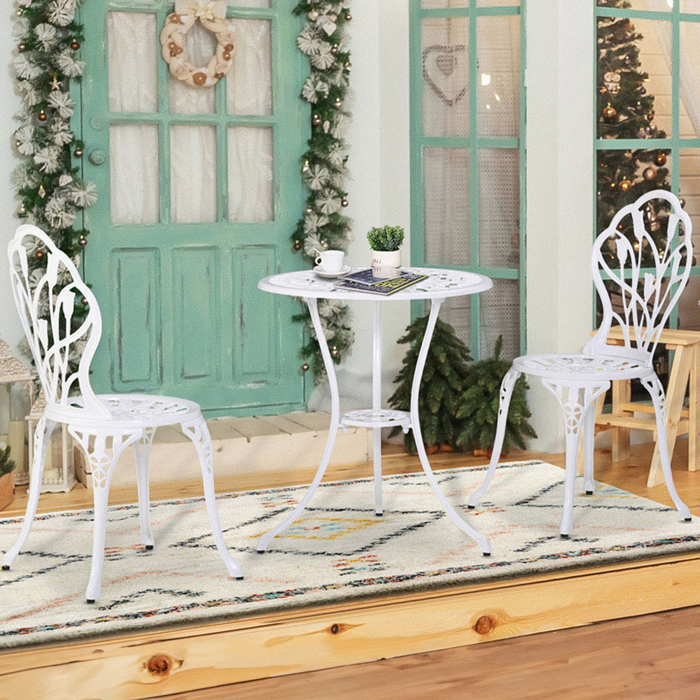 Enhance your outdoor space with this charming three-piece bistro set. Its elegant hollow-carved tulip design adds a touch of vintage style to any garden. Crafted from durable cast aluminium for lasting use, this set is built to withstand the elements. The table thoughtfully incorporates a parasol hole, providing welcome shade on sunny days.