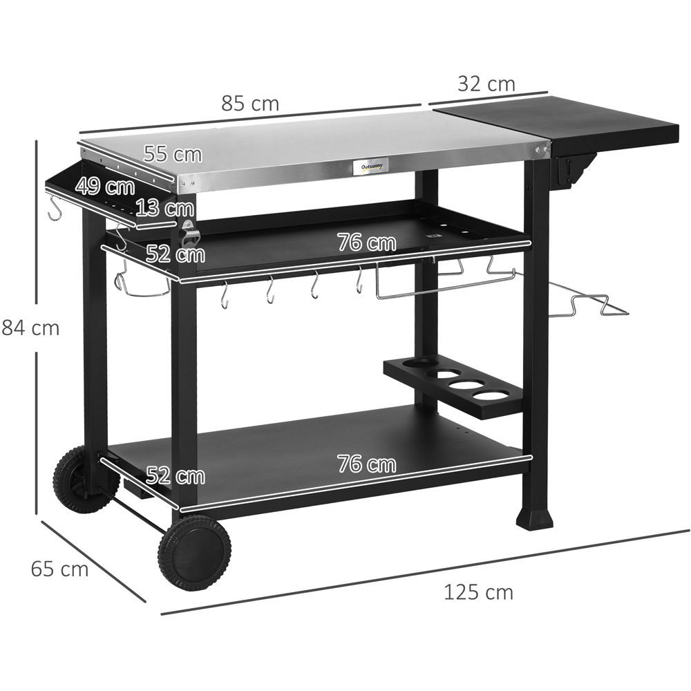 This BBQ station is a practical and stylish solution for storing your grilling essentials and more. Keep everything organised and within easy reach with its generous design, including a spacious top platform, six 'S' hooks, a dedicated gas tank hook, a handy side rack, paper towel holder, bottle opener, four bottle holders, a seasoning tray, a rubbish bag holder, and two convenient shelves. Mobility is a breeze thanks to its two integrated wheels, making it perfect for easy relocation around your outdoor space.