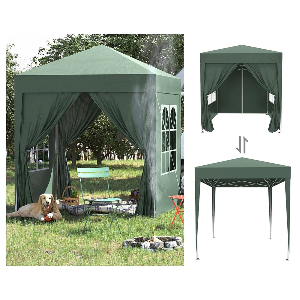 This Outsunny Green Marquee Gazebo Party Tent offers a fantastic, fuss-free outdoor shelter solution. Perfect for family parties, weddings, picnics, sports events, outdoor vendors, craft fairs, job sites and camping trips. This garden shelter features a robust, powder-coated steel frame, providing superior strength and suitability for winter use, while the hard-wearing, water-resistant Oxford canopy, complete with silver coating, blocks the majority of harmful rays and reduces interior heat. This easy pop-up gazebo includes four removable walls and comes equipped with a portable carry case for effortless transportation, along with ropes and ground stakes for enhanced stability. Size: 2 x 2m.