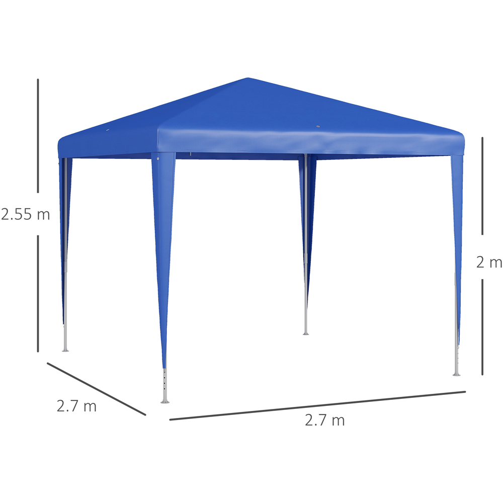 Upgrade your outdoor space with Outsunny 2.7x 2.7m Blue Gazebo. This Outsunny gazebo is a great way to create a shaded place when you require it. A powder-coated steel frame Provides a strong standing structure, with a weather-resistant canopy to create shelter inside. Comes complete with guy ropes and ground stakes for extra steadiness.