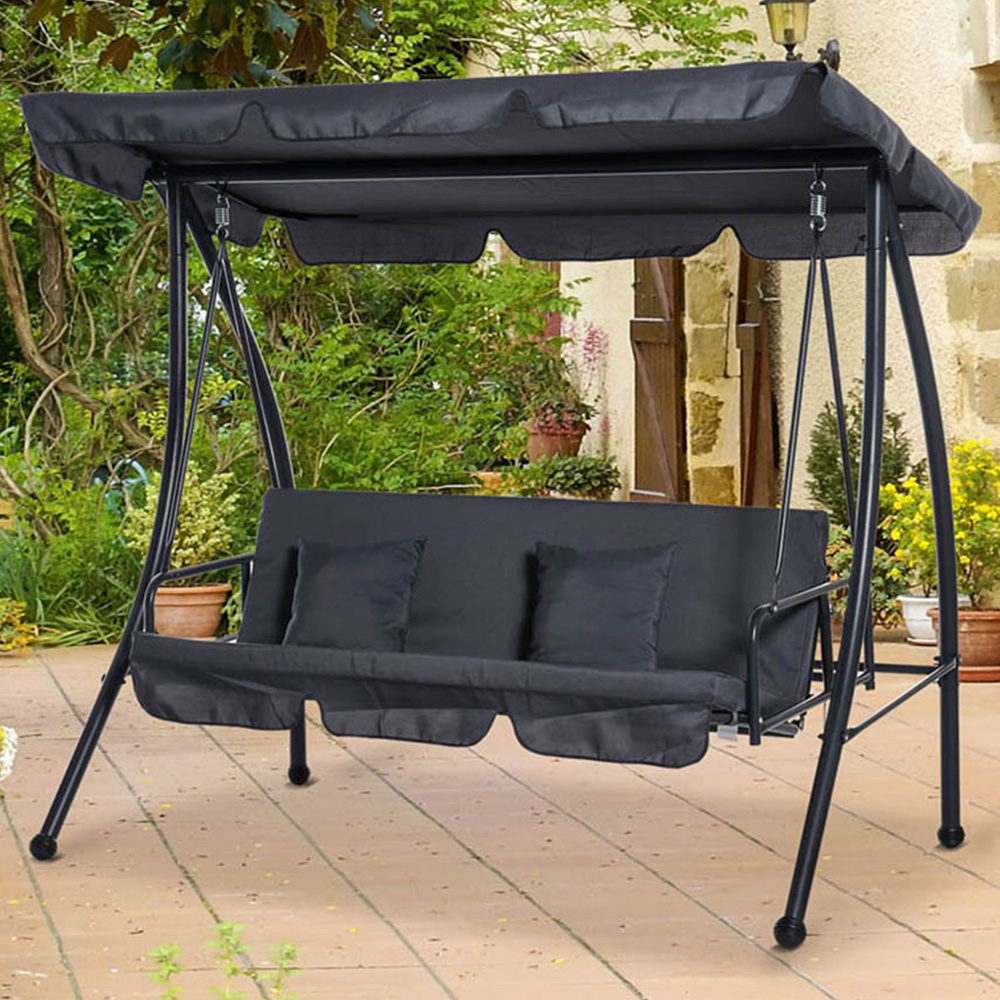Make the most of sunny days with this adaptable swing chair from Outsunny. Built with a sturdy steel frame for added stability, this dark grey swing chair features a protective canopy to shield you from harsh sun rays. Designed as a three-seater, this swing effortlessly converts into a comfortable hammock bed, perfect for relaxation. With its adjustable backrest and canopy, you can unwind in your garden with ease.