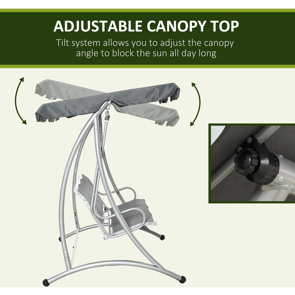 Introduce relaxation to your garden with the Outsunny Three Seater Swing Chair. Finished in dark grey, this garden swing features an adjustable canopy, allowing you to stay cool, comfortable and protected from the elements, or remove it entirely to soak up the sun. Designed with three well-ventilated seats, a high back, supportive arms and weather-resistant fabric, this swing bench seat provides total comfort, so you can fully immerse yourself in your leisure time. The robust steel frame comfortably supports up to 280kg, offering ample room for you and your friends. Its three-seater size gives you plenty of room. A long-legged base ensures balance, making this swing chair a charming addition to any outdoor furniture collection.