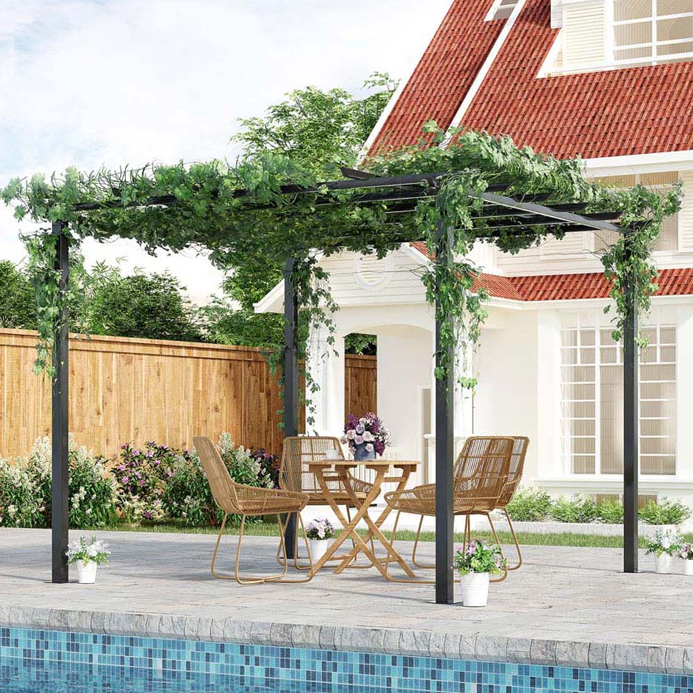 Add a beautiful focal point to your garden with Outsunny 3 x 3m Metal Pergola Gazebo. Made from metal with a black epoxy finish for prolonged strength and weather resistance - it is crafted into a tall and spacious structure which features a grid roof. It allows you to grow plants, vines and flowers from the bottom to the top, as well as being able to hang baskets from the top. Easy to maintain - the smooth finish surface of the pergola canopy wipes down with ease.
