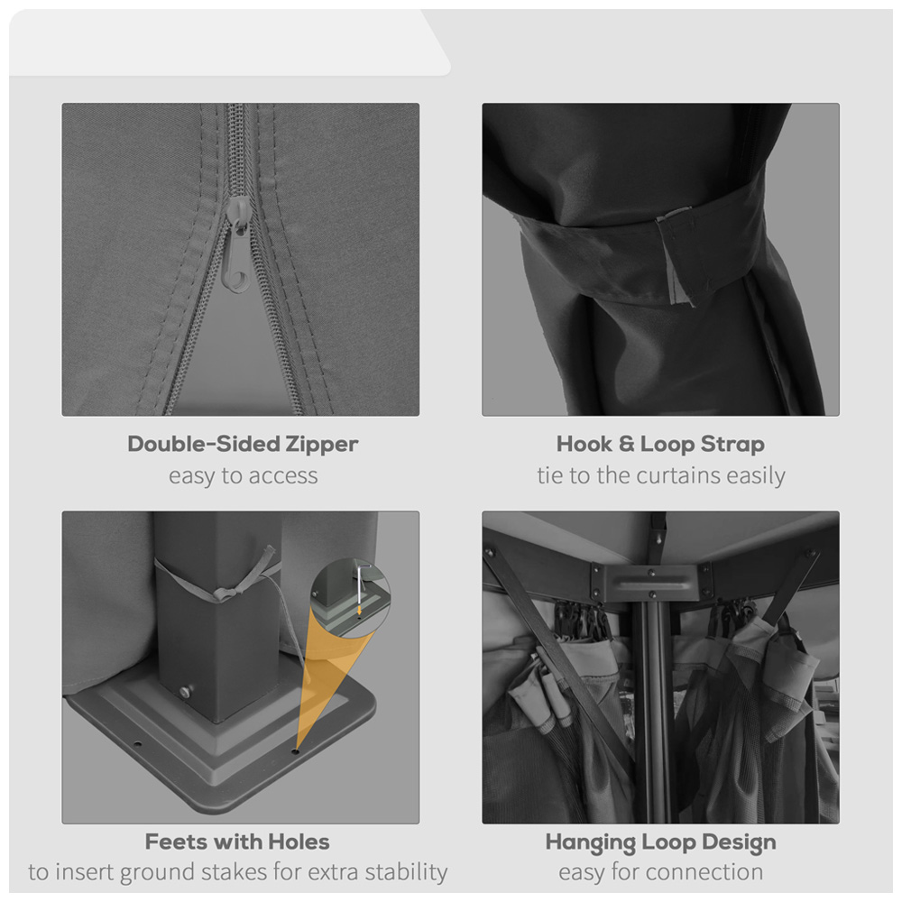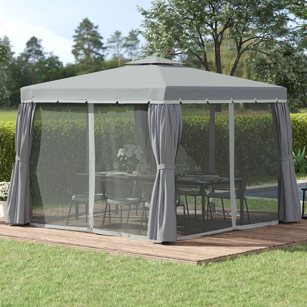 Expand your outdoor living space with the Outsunny 3 x 3m Grey Gazebo. Elegantly designed, this garden pavilion offers a generous shelter for you and your guests. The robust aluminium and steel frame ensures reliable stability for outdoor use. A polyester canopy provides a comfortable shaded area, while the two-tier roof design encourages essential airflow. For added privacy, curtains are included, complete with integrated netting to keep insects at bay. This gazebo comes complete with all necessary anchoring accessories. Dimensions: 3 x 3m.