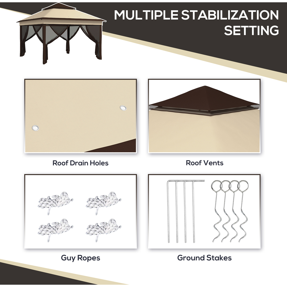 The Outsunny 3 x 3m Beige Pop Up Gazebo is a convenient shelter for your outdoor gatherings. It can be assembled quickly and easily. The gazebo features a powder coated metal frame that provides a strong core. The height of the gazebo is adjustable between 252cm, 262cm, and 272cm, allowing you to set it at the level you desire. The removable mesh curtains enable you to create a private or open atmosphere whenever you want, thanks to the easy zip fastening. The gazebo also comes with a carrying bag for easy storage and transportation. It has enough room to accommodate approximately 6 to 9 people. The portable pop-up design allows for quick setup and takedown, saving you time and effort. The gazebo includes guy ropes and ground stakes to secure it to the ground.