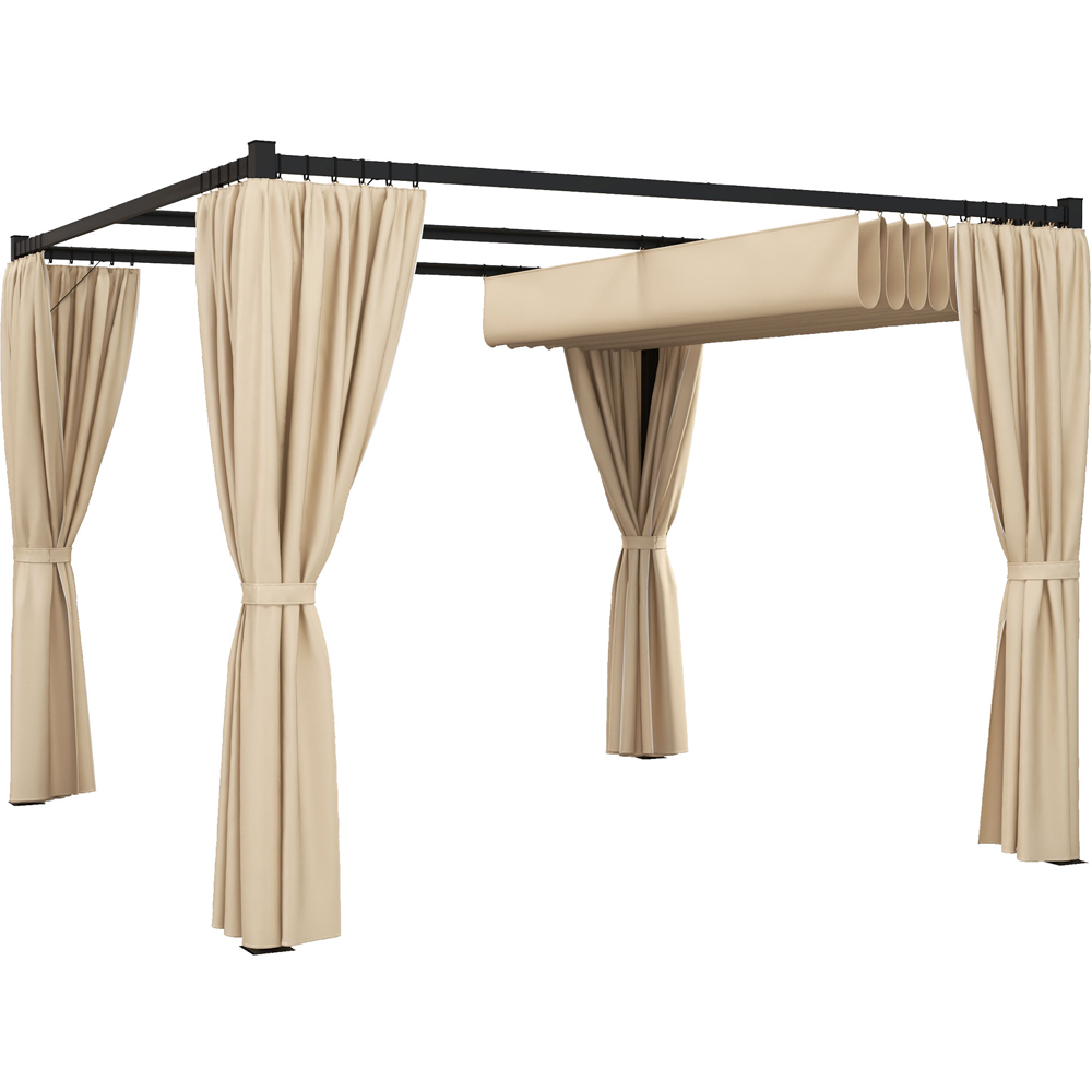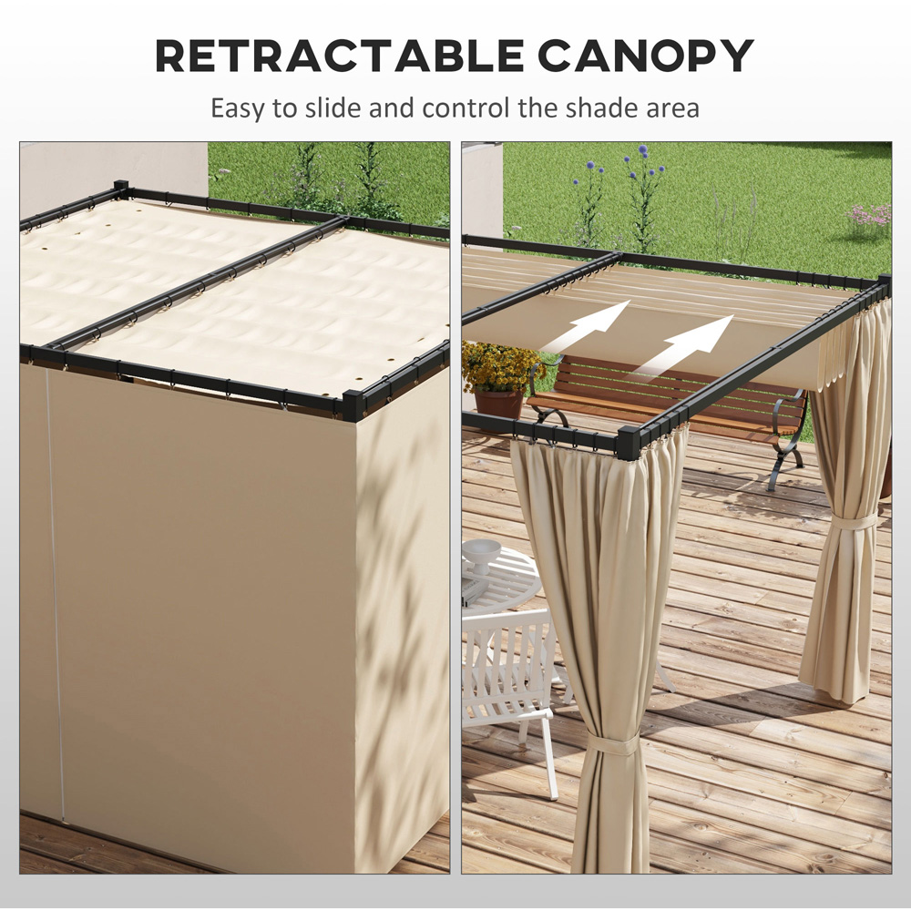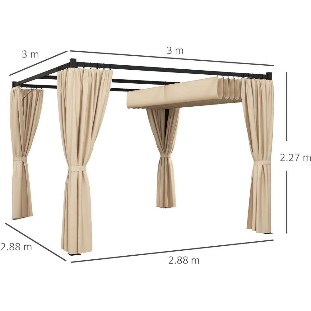 Enrich the beauty of your outdoor area with the Outsunny Beige Retractable Roof Pergola Gazebo. This gazebo has an anti-rust coated sturdy metal frame that keeps it stable and upright. This retractable pergola features a PU-coated polyester top that can be moved across to deal with varying amounts of light. It also features four side curtains that can be removed or retained to block wind and provide a private space for you to enjoy your leisure time. The package includes sixteen ground stakes and eight expansion screws for extra stability. Dimensions: 3 x 3m.