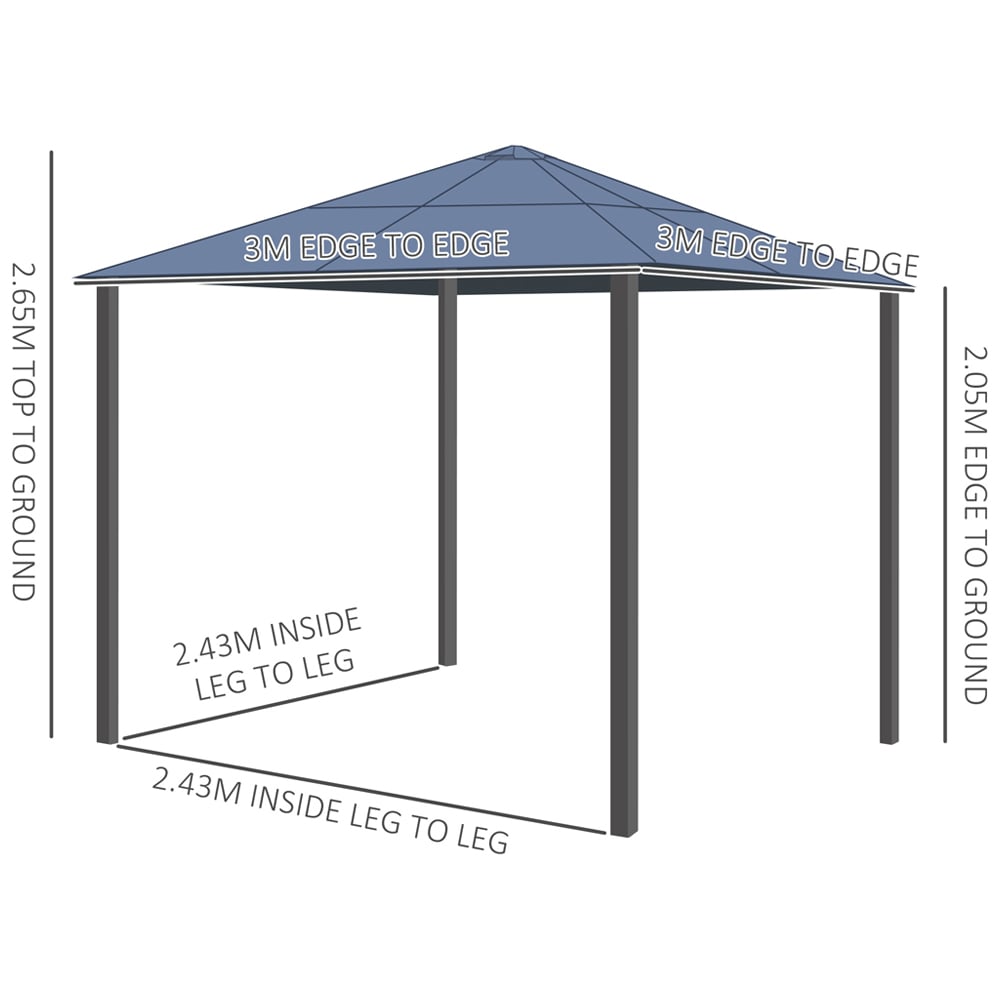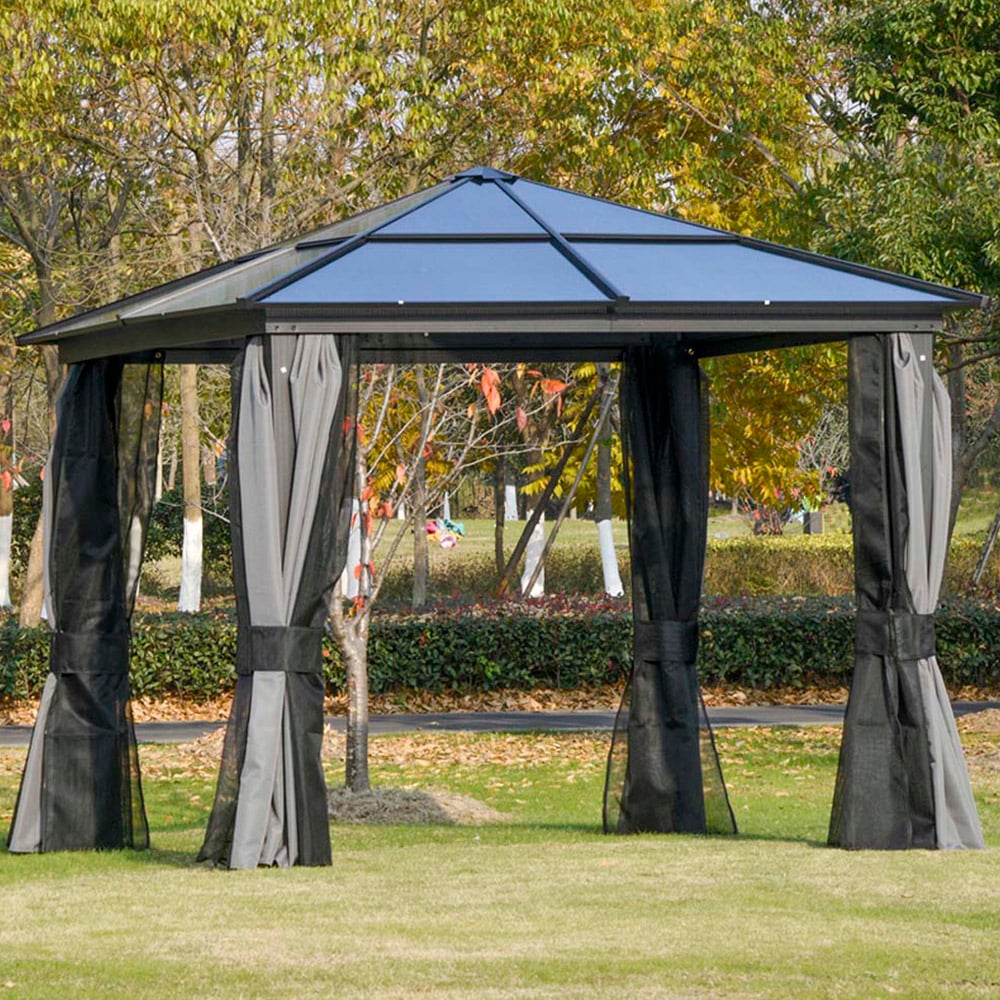 Make a stunning garden addition with this 3 x 3m Black Gazebo Canopy with Roof from Outsunny. Offering privacy and protection, this canopy comes with a polycarbonate roof and curtains, which can be tied back when not needed. Also, it includes mesh netting to ensure better air circulation and keep pests away. Apart from this, the tent offers better protection from the sun, rain, and wind and keeps the inside cool. It comes complete with a solid roof for anyone looking to create the right impression for their next BBQ and outdoor party. Size: 3 x 3m.