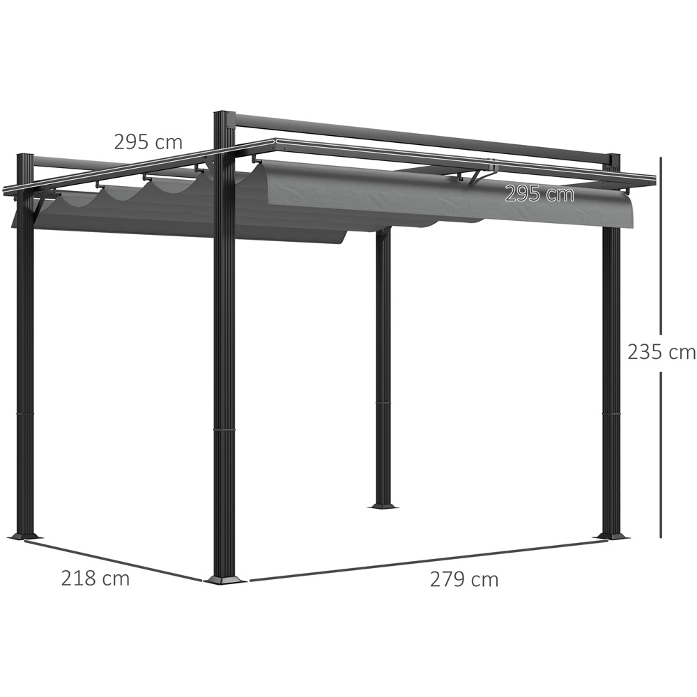 Make the most of your outdoor experience with this Outsunny 3 x 3m Dark Grey Retractable Garden Gazebo. Whether you prefer basking in the sunshine or relaxing in the shade, you can easily adjust the fabric roof panel to your desired position. The sturdy aluminium structure ensures stability, and it comes with ground stakes and expansion screws for secure attachment to the floor. With ten grommet holes on the fabric, water drainage is effortless, preventing any damage to the material or potential hazards. Enhance your outdoor space like never before with this versatile pergola.