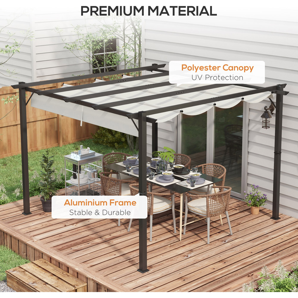 Provide a shady and comforting spot in the garden to be utilized all year round with Outsunny Three x Three m Light Grey Aluminium Retractable Pergola Gazebo. A perfect accompaniment to any party, barbecue or social gathering, the adjustable canopy is crafted with light brown polyester fabric to keep guests sheltered. With a retractable canopy roof - the metal pergola can be moved to any position depending on the occasion and the weather. Crafted from a rust-resistant aluminium frame, it also comes with steel top bars, feet and connectors on the frame for long-lasting use. The UV-resistant canopy keeps you shaded on warm and sunny days, while the grommet holes on the pergola canopy allow liquid to drain safely.