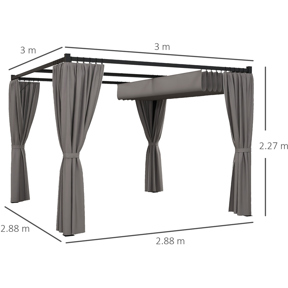 Enrich the beauty of your outdoor area with the Outsunny Light Grey Retractable Roof Pergola Gazebo. This gazebo has an anti-rust coated sturdy metal frame that keeps it stable and upright. This retractable pergola features a PU-coated polyester top that can be moved across to deal with varying amounts of light. It also features four side curtains that can be removed or retained to block wind and provide a private space for you to enjoy your leisure time. The package includes sixteen ground stakes and eight expansion screws for extra stability. Dimensions: 3 x 3m.