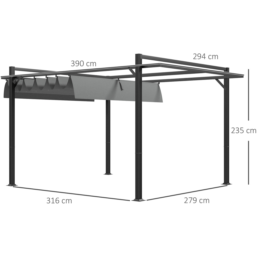 Make the most of your outdoor experience with this Outsunny 3 x 4m Dark Grey Retractable Garden Gazebo. Whether you prefer basking in the sunshine or relaxing in the shade, you can easily adjust the fabric roof panel to your desired position. The sturdy aluminium structure ensures stability, and it comes with ground stakes and expansion screws for secure attachment to the floor. With 12 grommet holes on the fabric, water drainage is effortless, preventing any damage to the material or potential hazards. Enhance your outdoor space like never before with this versatile pergola.