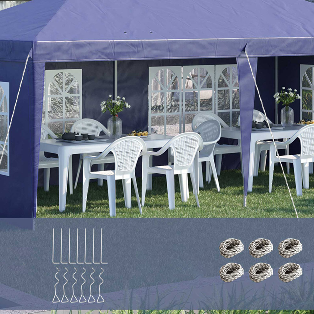 Transform your outdoor area into the perfect summer haven with this Outsunny 3 x 6m heavy-duty blue gazebo. Designed as a fuss-free, instant shelter, this pop-up gazebo is ideal for gardens and outdoor spaces, offering a spacious area to accommodate numerous guests. The gazebo features four removable side walls, allowing you to effortlessly create a fully open or semi-enclosed space. Built with a robust, powder-coated steel frame, it provides a strong and reliable core that's easy to assemble and disassemble. For added convenience, it includes a carry bag, making transportation simple. Complete with guy ropes and ground stakes, this gazebo ensures enhanced stability.