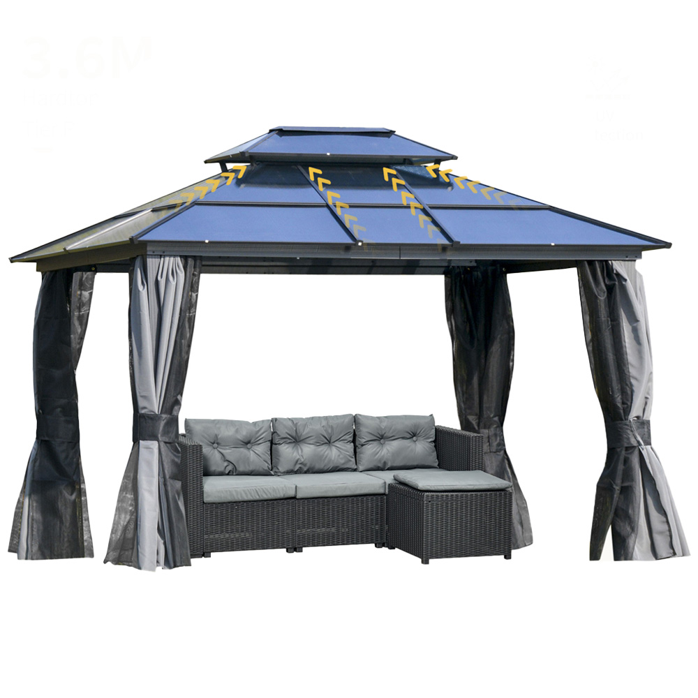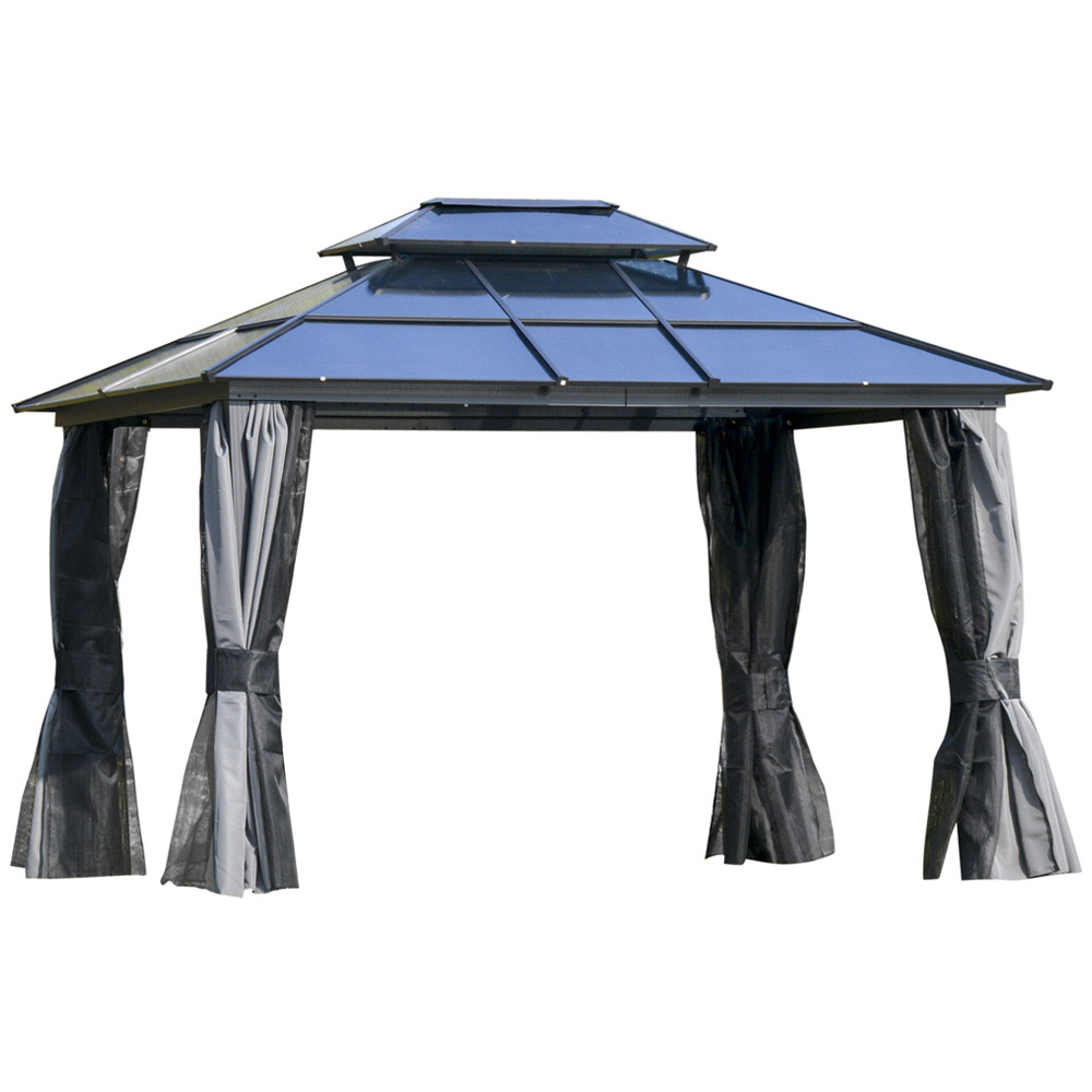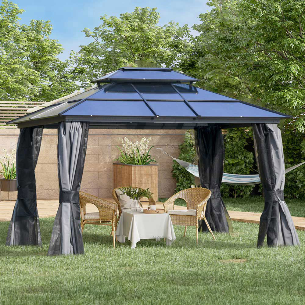 Relax in your outdoor space with this Outsunny 3.6 x 3m Double Tier Roof Gazebo. This hardtop gazebo is a solid and fantastic shelter for garden parties, BBQs, and outdoor celebrations. It features a polycarbonate board roof to protect against direct sunlight, light wind, and rain. Generously sized, the tent provides enough shelter for plenty of people inside without much hassle. Also, each side is fitted with a curtain for privacy whenever you want, with a second-layer mesh curtain to protect the inside from insects. The unit comes with mounting accessories for extra stability. Size: 3.6 x 3m.