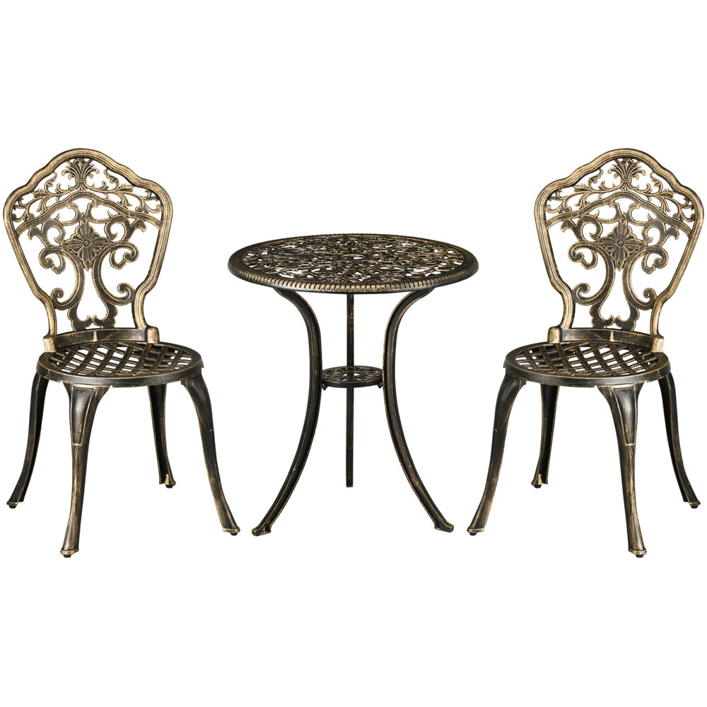 Elevate your outdoor ambience with the striking Outsunny 3 Piece Bronze Cast Bistro Set, a quintessential blend of classic elegance and floral artistry. This charming ensemble includes two intricately designed chairs and a matching table, all crafted from robust cast aluminium, ensuring durability and stability for outdoor use. The table is thoughtfully designed with a 48mm diameter hole at its centre, allowing for easy insertion of a parasol to provide shade during sunny days.