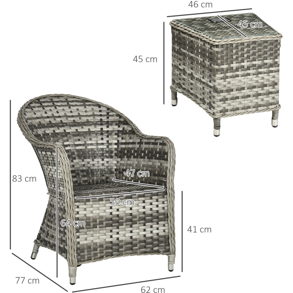 Do those lazy afternoons in the sun the right way in this 3 Piece Grey Rattan Bistro Set from Outsunny offering two armchairs and a matching table with company. The table is topped with a tempered glass top which gives it a sleek look while making it a safe place to rest items. The set has a powder-coated aluminium frame for a strong structure, wrapped in stylish plastic rattan, which doubles the durability. Complete with seat and back cushions for comfort, it is suitable for outdoor areas like gardens, patios, conservatories and more. Assembly required. Chair Dimension: W 62 x D 77 x H 83cm. Seat Size: W 59 x D 47cm. Seat Height (without cushion): 41cm. Table Dimension: W 46 x D 45 x H 45cm. Weight Capacity: 160kg(chair), 50kg(table). Protect your garden furniture with our durable and waterproof covers. Explore our wide range of heavy-duty Garden Furniture covers to find the perfect fit for your needs.