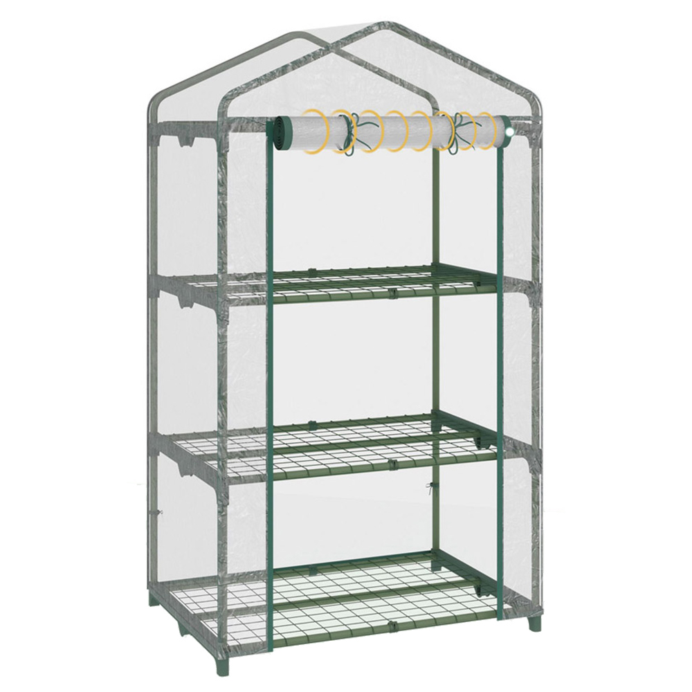 Grow your own in even the smallest of spaces with this Outsunny greenhouse. Perfect for balconies, porches, or any snug corner, its compact 69 x 49cm design features three tiers for maximum growing area. The sturdy steel frame provides reliable support, while the protective PVC cover lets in sunlight while shielding plants from harsh weather. Ingeniously designed grid shelves prevent water damage, and a convenient roll-up door makes tending your plants a breeze. Whether you',re a seasoned gardener or just starting out, this greenhouse is perfect for you.