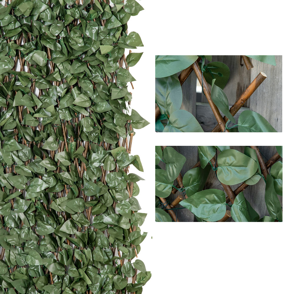 Transform your outdoor space with this four-panel Outsunny expandable trellis fence. Easily adjust its width from 32cm to 200cm to perfectly fit your needs, whether it',s a small or large area. Boasting 350 realistic-looking laurel leaves in a vibrant, weatherproof green, this artificial fence offers a natural look without the hassle of real plants. Rain or shine, snow or sun, this fence will maintain its lush green appearance, providing year-round beauty and privacy.