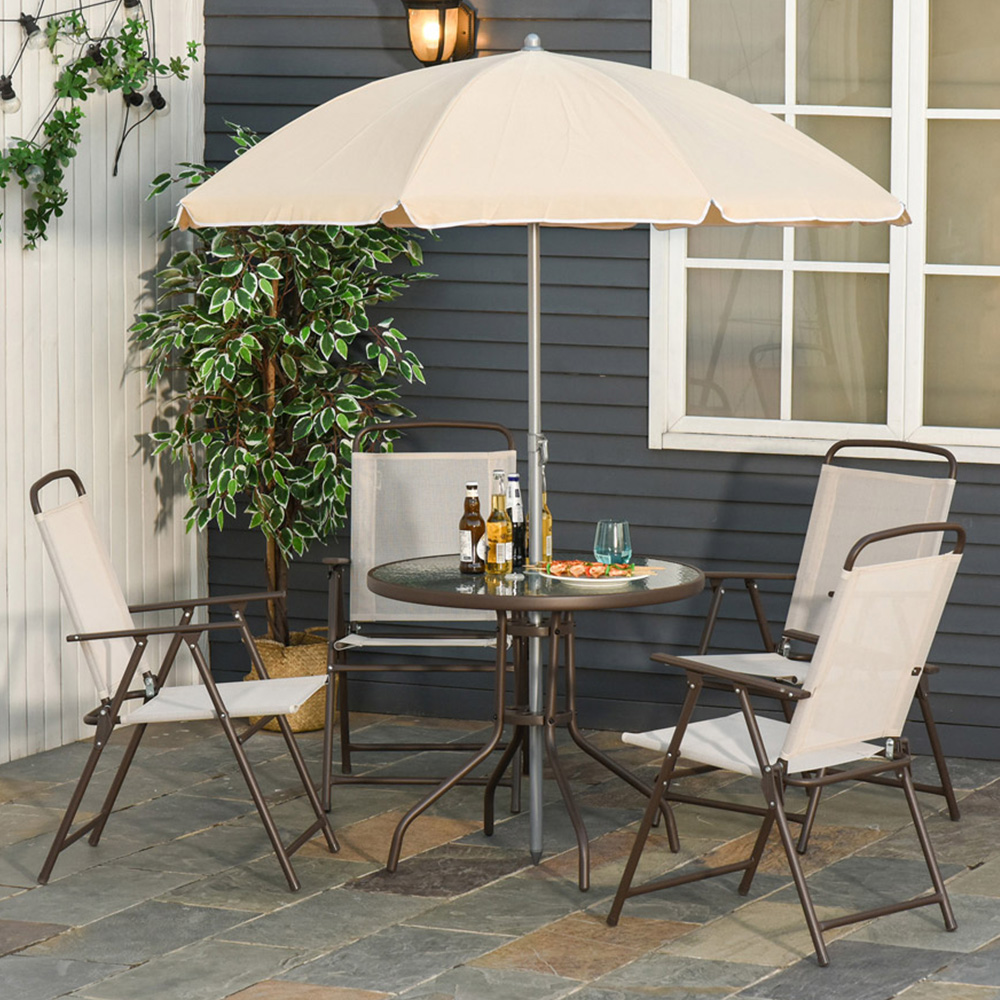 Upgrade your outdoor space with the Outsunny 4 Seater Bistro Set Beige. The set includes four foldable chairs, a round tempered glass-top table and a parasol umbrella, so you've got everything you need to dine with family or friends and stay protected. The metal frames of each piece are strong and rust-resistant, with the breathable mesh chairs making them perfect for hotter climes. This set is an excellent addition to your patio all year round. Protect your garden furniture with our durable and waterproof covers. Explore our wide range of heavy-duty Garden Furniture covers to find the perfect fit for your needs.