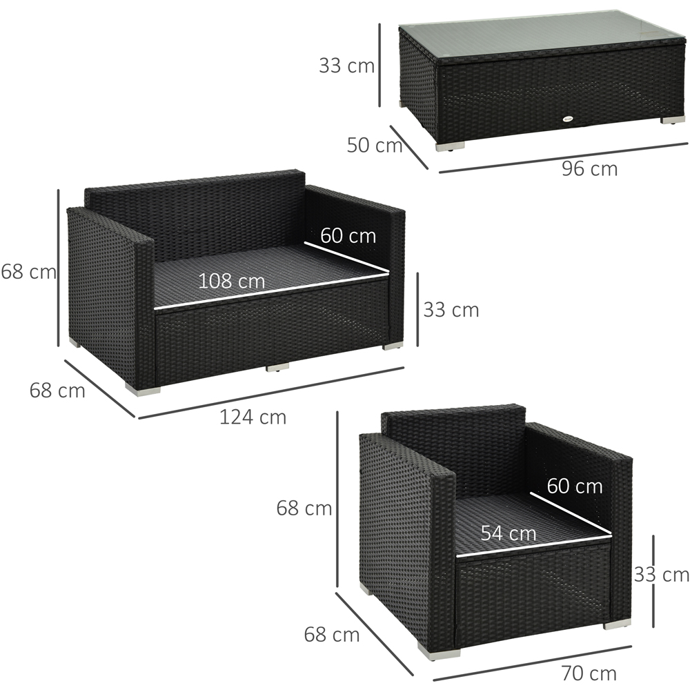 Maximise your outdoor relaxation with the Outsunny 4-Seater Rattan Sofa Lounge Set, finished in a stylish black and white. This versatile rattan sofa set comprises two armchairs, a loveseat, and a handy coffee table. Designed for flexible garden layouts, the free rotation design allows you to configure the set to perfectly suit your space and leisure needs.
