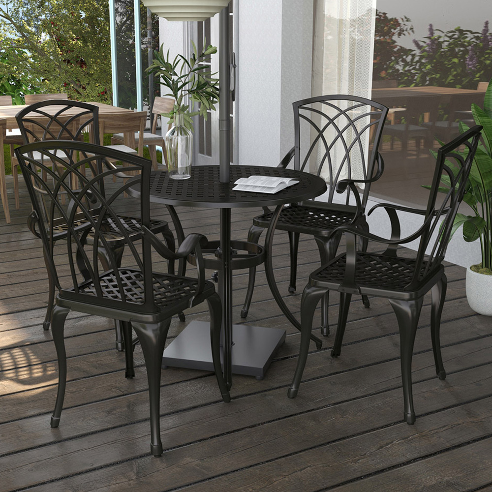 Elevate your outdoor entertaining with the Outsunny Garden Dining Set. This four-seater set, featuring a round table and four matching chairs, offers a timeless style perfect for garden gatherings. Crafted from robust, rust-resistant cast aluminium, this set ensures lasting durability. The table cleverly incorporates a central parasol hole, providing welcome shade on sunny days. Each chair boasts a comfortable seat and supportive backrest with a stylish cut-out design, while sturdy feet maintain stability. Complete your outdoor haven with one of our durable, waterproof garden furniture covers – find the perfect fit for your set from our extensive range.