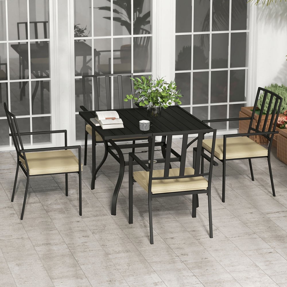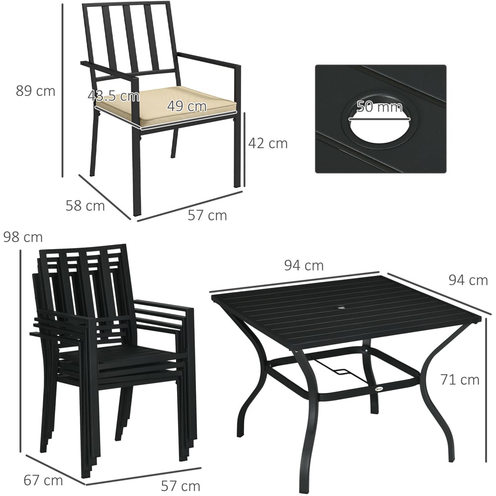 Gather your loved ones around the Outsunny Four-Seater Garden Dining Set with Umbrella Hole. This durable metal set, finished in a sleek matte black, brings simple style to any outdoor space. The square dining table provides ample room for dining, whilst the four armchairs, complete with removable and washable cushions, ensure everyone sits comfortably. The table also features a 50mm parasol hole, suitable for 38 to 48mm parasol poles, offering welcome shade on sunny days. This strong and tough garden dining set is perfectly suited for outdoor use.