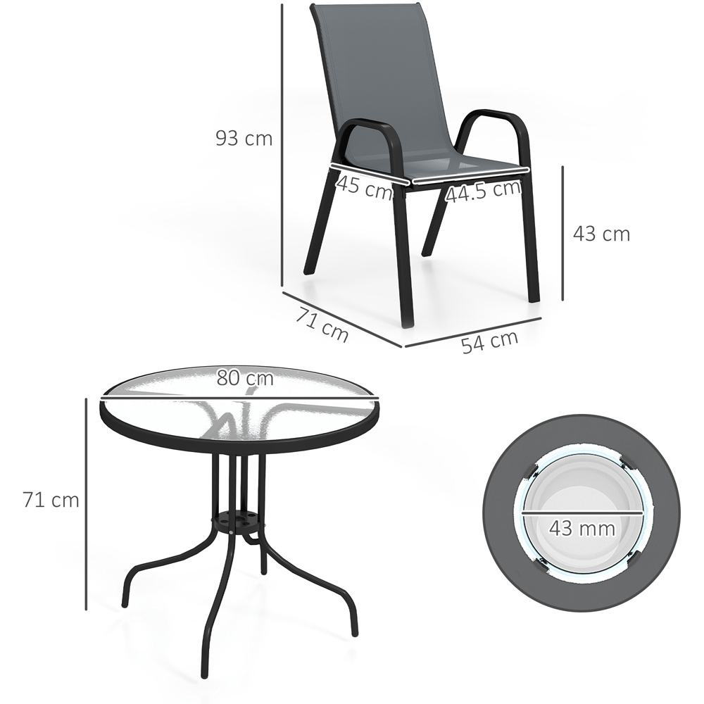 Enjoy al fresco dining or relaxing moments with this stylish patio set. A round table and four stackable chairs provide ample seating for gatherings, while the space-saving stackable design ensures convenient storage when not in use. Robust powder-coated steel frames offer durability for outdoor use, and a thoughtfully placed 43mm hole in the table top securely accommodates a parasol, providing welcome shade.