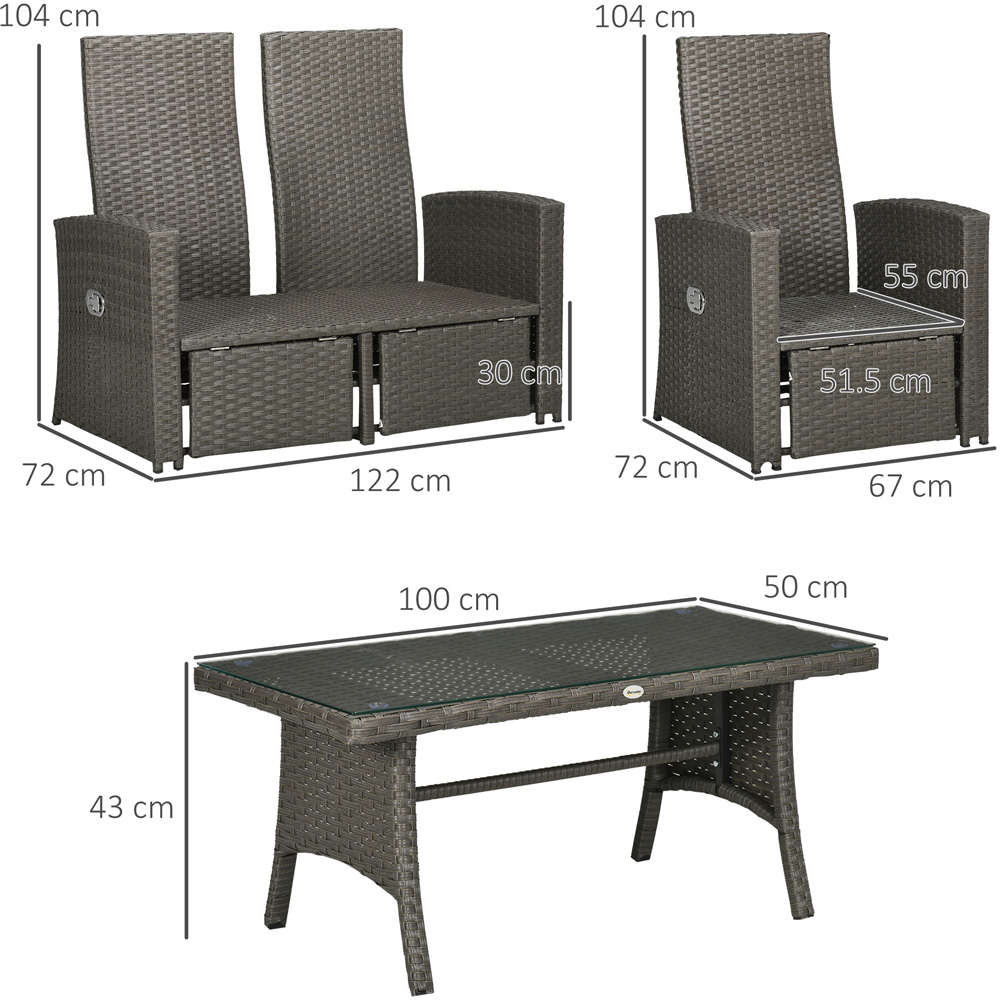 Make a trendy addition to your outdoor space with the Outsunny Rattan Sofa Lounge Set. This grey set includes a loveseat, two armchairs and a matching coffee table. The coffee table features a smooth glass top with a woven rattan finish. This set features strong steel frames covered with rattan for protection and durability. The cosy padded seats and back cushions provide high-quality comfort for relaxation purposes. The armchairs have adjustable backrests with reclining angles between 90° to 135° and the footrests can be elevated according to your convenience. Protect your garden furniture with our durable and waterproof covers. Explore our wide range of heavy-duty Garden Furniture covers to find the perfect fit for your needs.